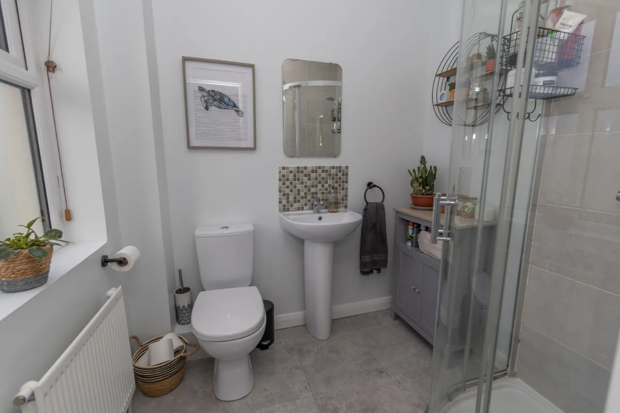 Ensuite Shower Room with tiled flooring, single radiator, and a white suite comprising WC and wash hand basin with wall-mounted mirror above. Features a mains shower with glass door and tiled wall benind.
