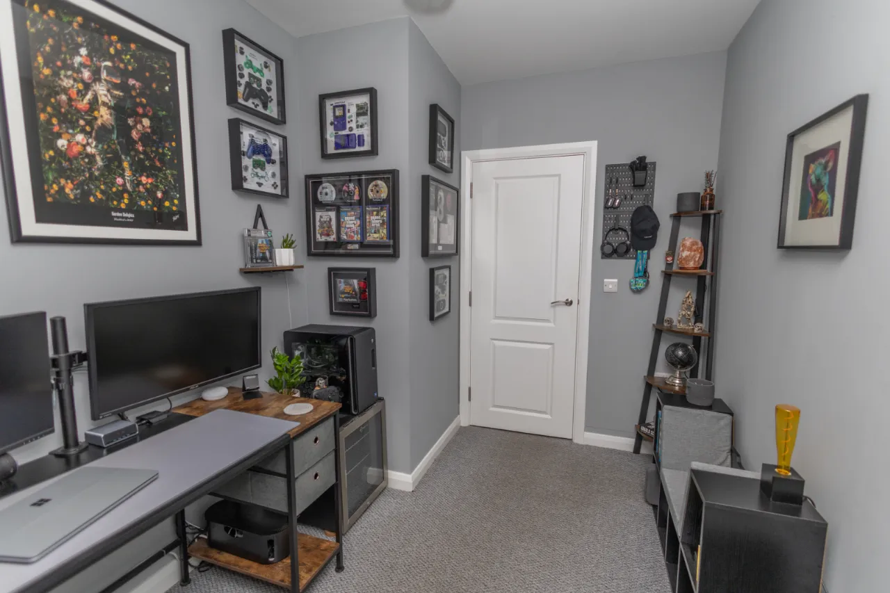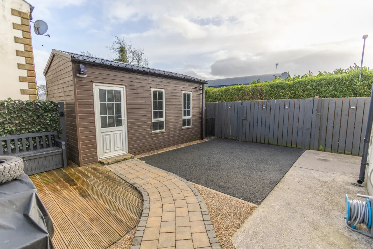 Exterior with parking to the front and rear, both areas tarmacked, and an enclosed rear garden. The property also includes a shed with electricity.