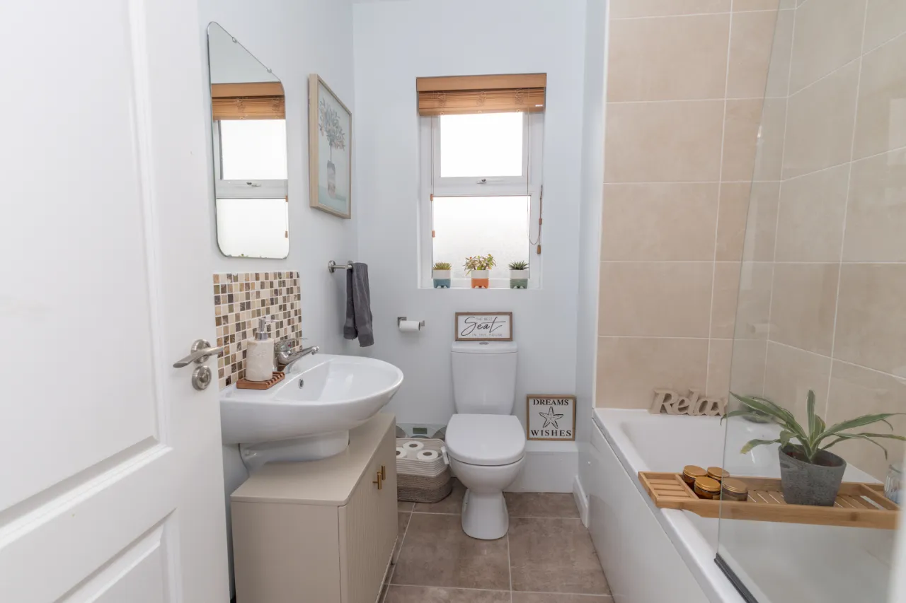 Downstairs WC with tiled flooring, white suite including WC and wash hand basin with tiled splashback, and a single radiator.