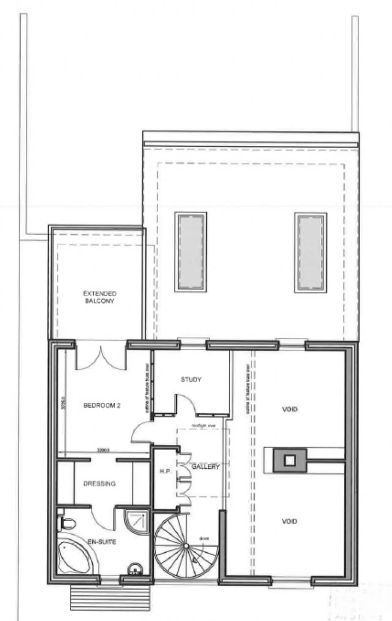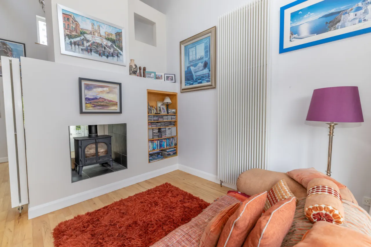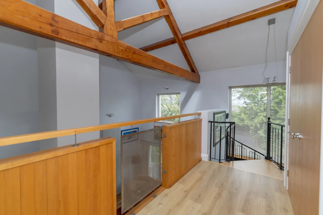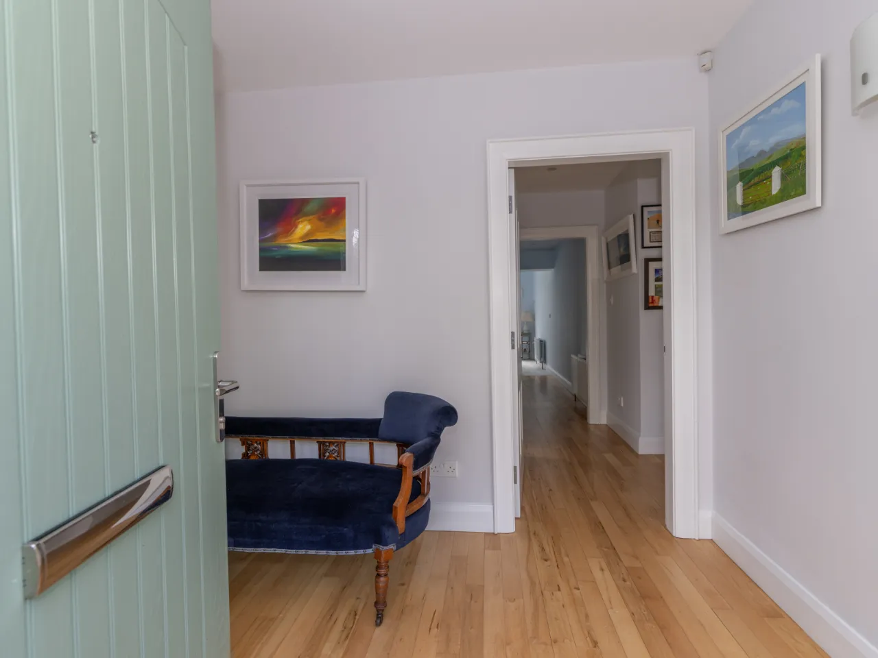 Solid wood flooring, double radiator, and recessed spotlights. Features an internal window-style opening overlooking the adjoining hall, adding light and a sense of connection to the space.