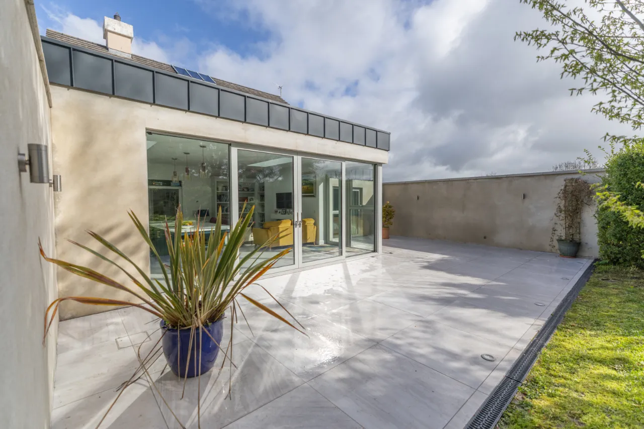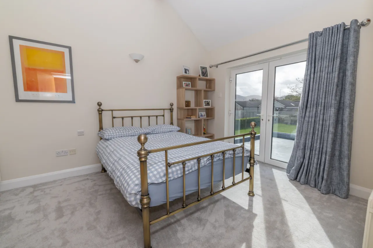 The living area offers a comfortable and contemporary setting, complete with an electric remote-control fire, TV point, and excellent natural light. Patio doors lead directly to the rear garden, creating a seamless indoor-outdoor flow.