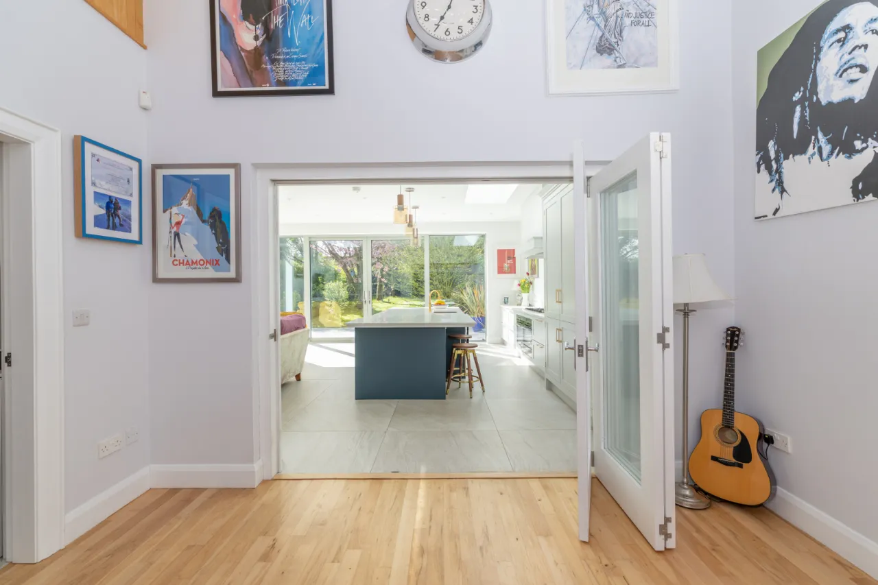 A superb open plan space featuring a high-quality Hannaway kitchen in a galley-style layout with quartz worktops and tiled splashback behind the hob. The central island unit includes a Quooker hot water tap, inset stainless steel sink, Bosch dishwasher, and integrated bin storage, along with a raised breakfast bar with quartz surface. The kitchen is further enhanced by a four-ring gas hob, two AEG electric ovens, and an integrated pantry with fridge freezer. The space also benefits from underfloor heating, adding comfort and efficiency throughout.
