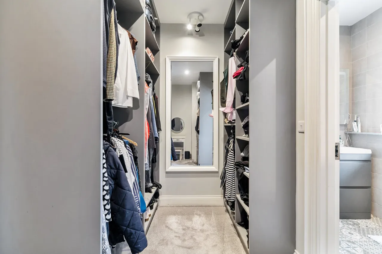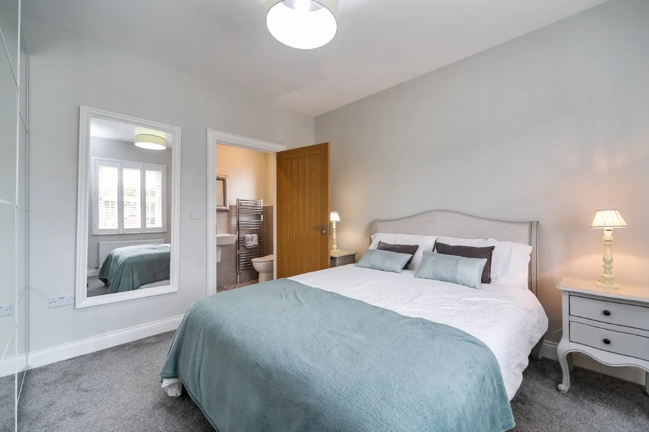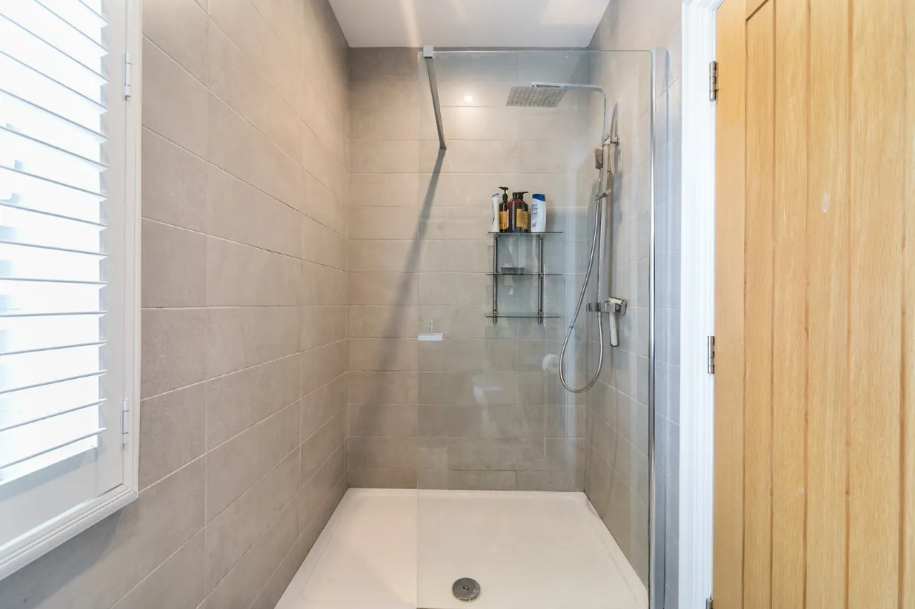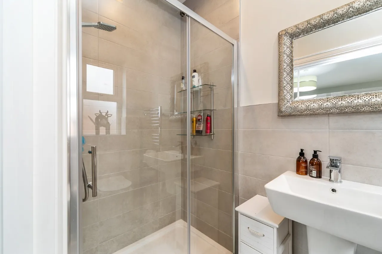 Low flush WC, pedestal wash hand basin, fully tiled shower cubicle, spotlighting, chrome heated towel radiator