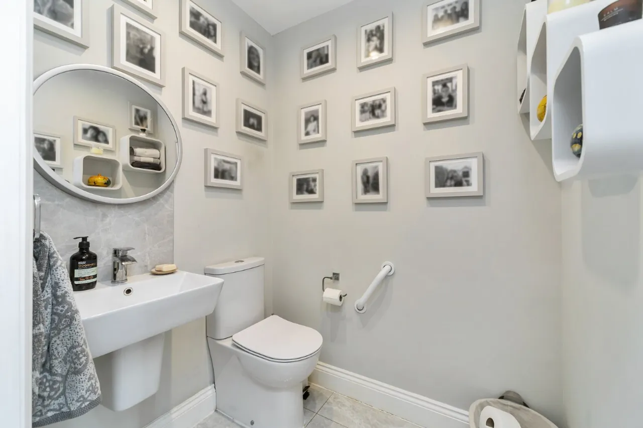 Tiled floor, low flush WC, pedestal wash hand basin with single tap, spotlighting