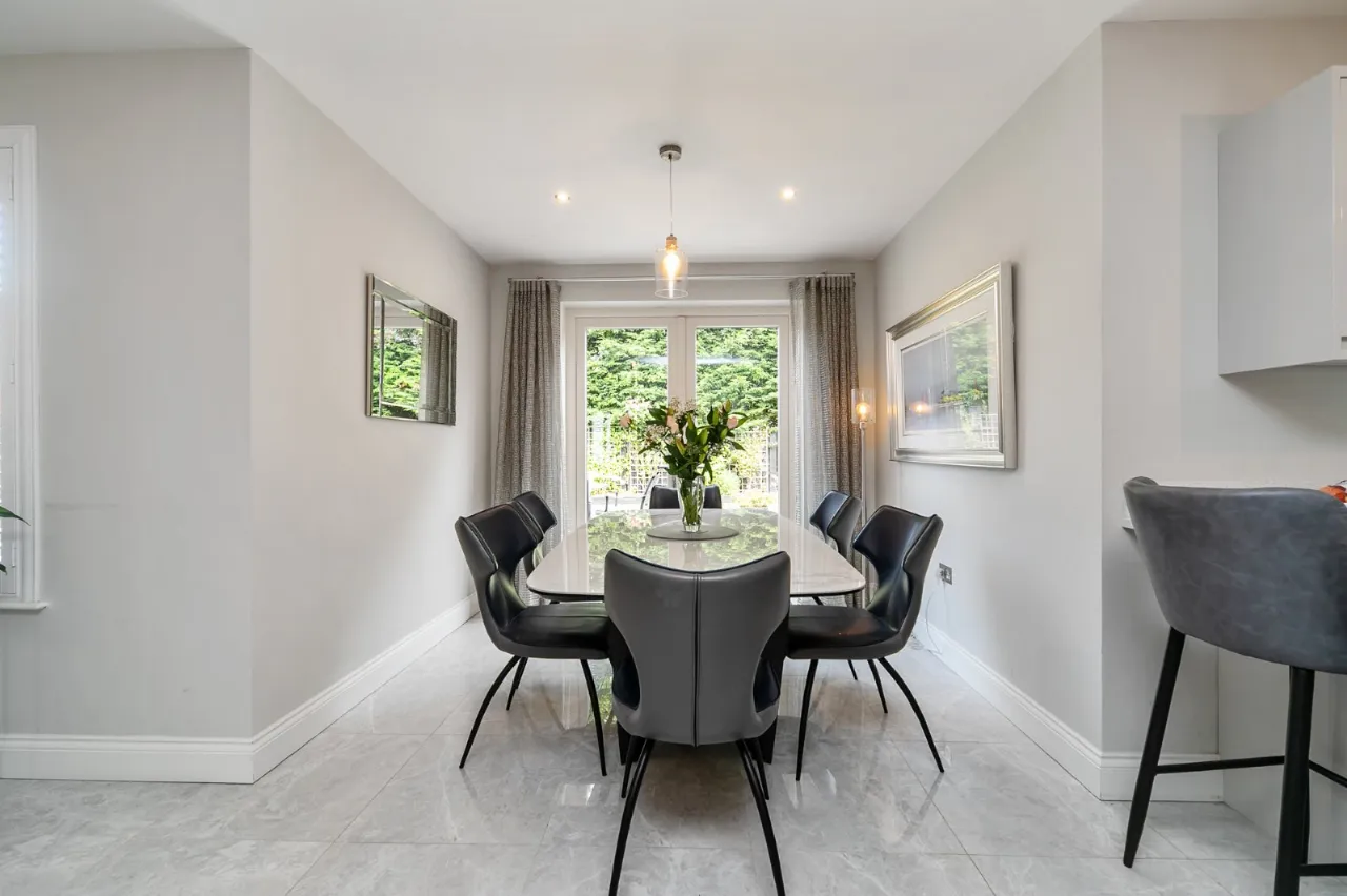 Spotlighting, tiled floor, range of high and low units, 1.5 inset composite sink with mixer taps, quartz worktops, 5 ring gas hob, glass and stainless steel extractor fan. Double electric oven, integrated dishwasher, pull out bin, space for American fridge freezer, space for wine fridge, double uPVC doors leading outside