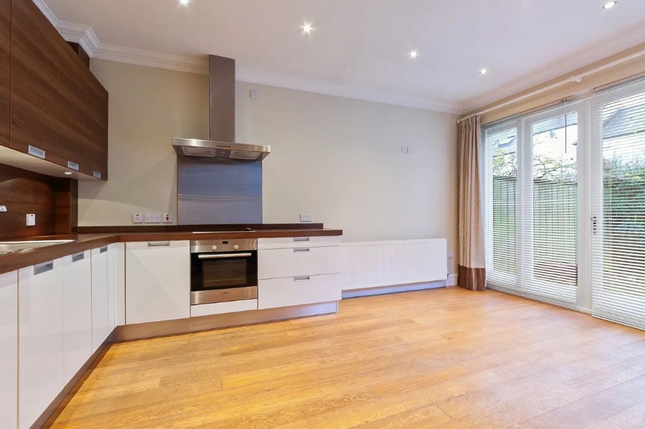 Contemporary kitchen with excellent range of units, work surfaces, sink unit, integrated oven and four ring gas hob, splashback and extractor hood, integrated dishwasher and fridge freezer, double doors to rear patio and garden