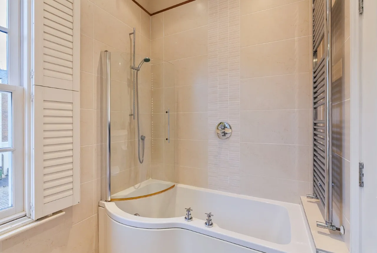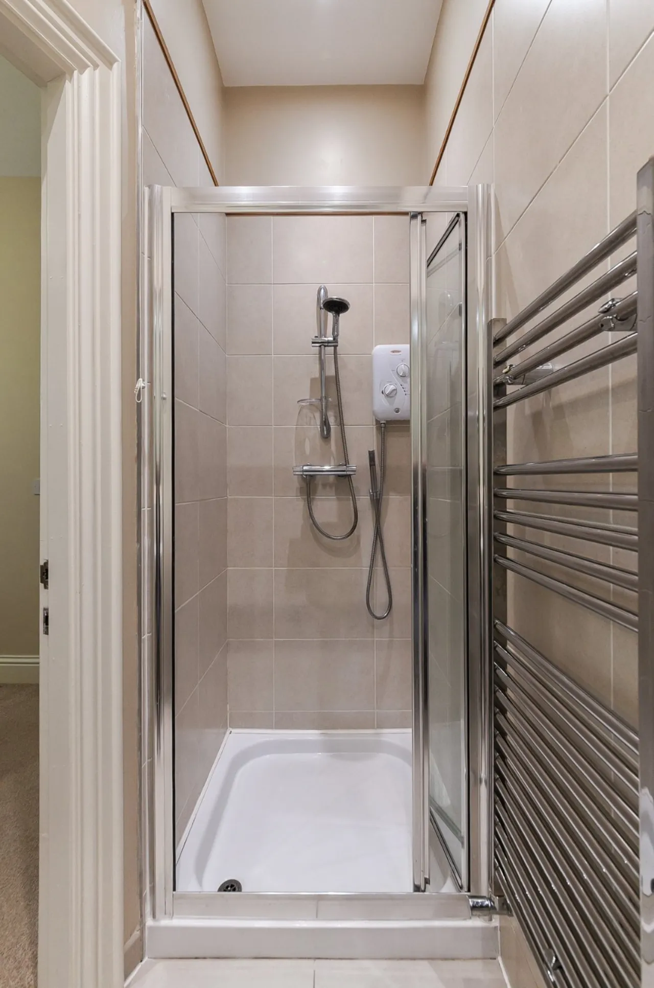 Wash hand basin, WC, heated towel rail, corner shower cubicle, ceramic tiled floor, part tiled walls, extractor fan
