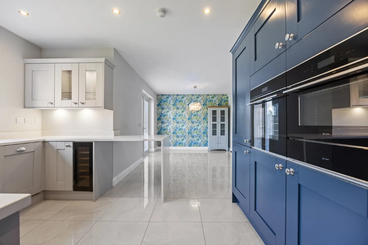 Tiled floor, spotlighting, range of high and low level units, quartz worktops, inset sink, integrated dishwasher, wine fridge, ceramic hob, extractor fan, electric oven, integrated microwave, integrated fridge freezer