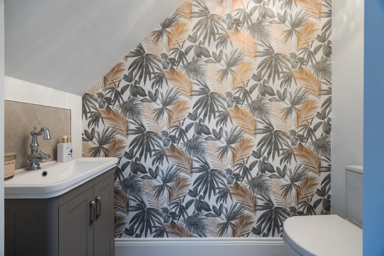 Tiled floor, pedestal wash hand basin with vanity unit, low flush WC, extractor fan