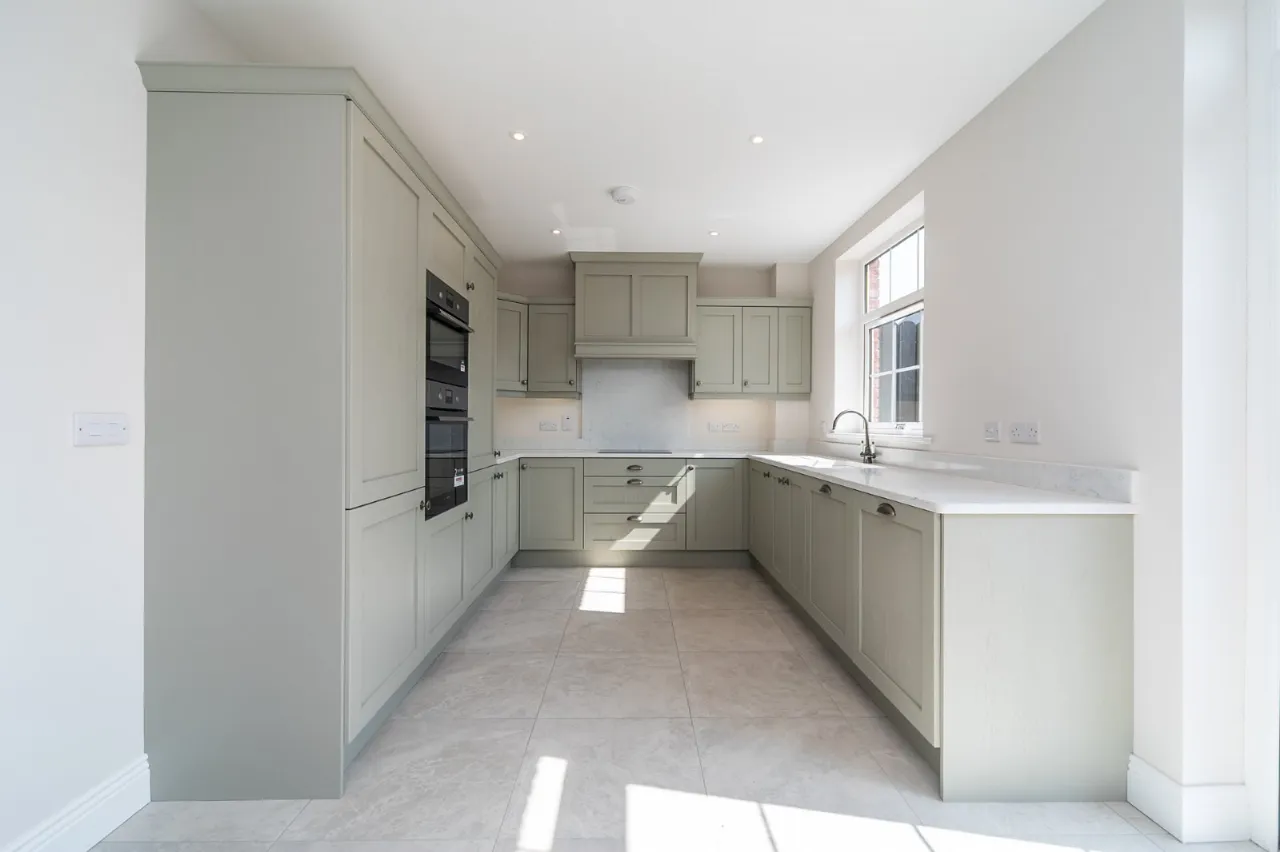 Tiled floor, ESSE Warmheart wood-burning stove, bespoke custom alcove built in hand painted units