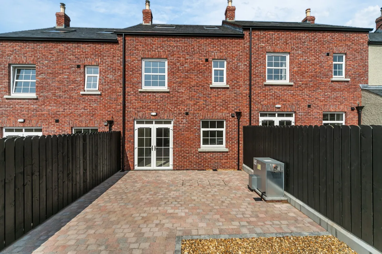 Patio doors leading to private red brick paved rear garden, decorative gravel area, oil tank, outdoor tap, back gate leading to external courtyard parking