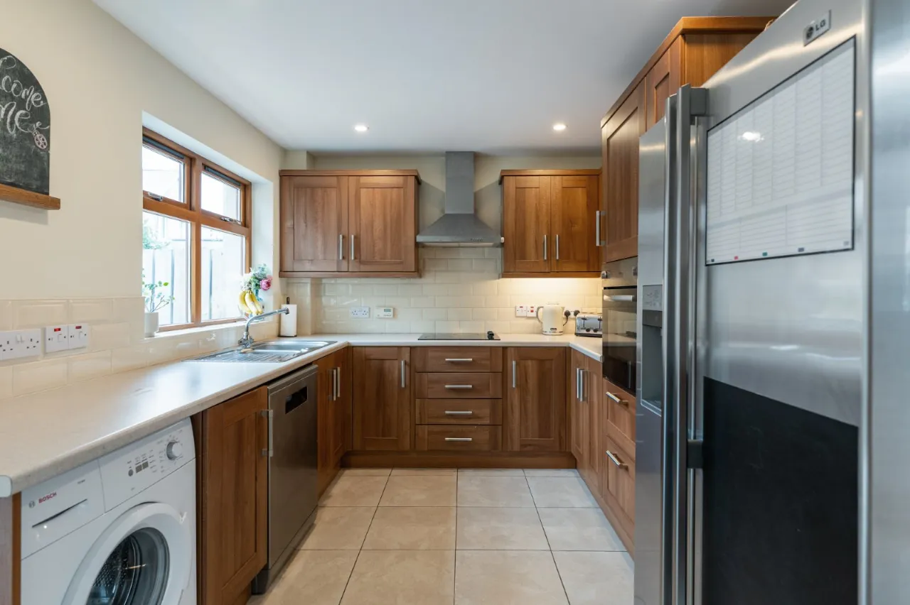 Range of high and low level shaker style units, laminate work surfaces, space for fridge freezer, plumbed for washing machine, plumbed for dishwasher, ceramic tiled floor, electric oven, ceramic hob, stainless steel extractor hood over, partly tiled walls hardwood double glazed French doors to patio garden.