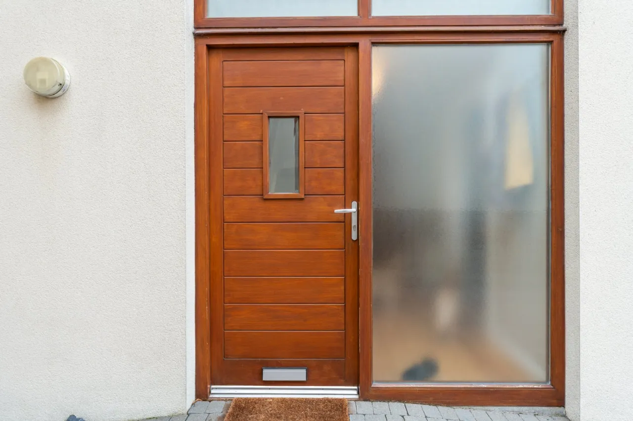 Hardwood front door and double glazed side panel.