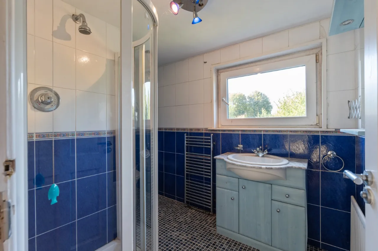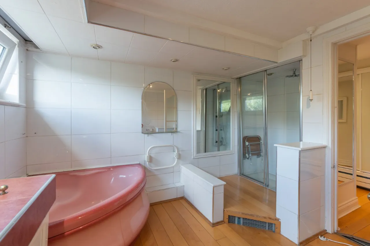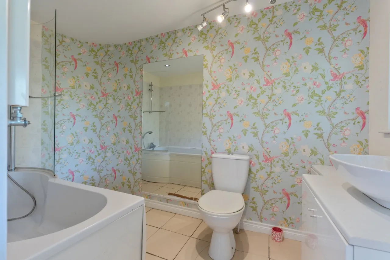 Coloured suite comprising: Corner panelled bath, low flush WC, wash hand basin in vanity unit, double shower cubicle, fully tiled walls.