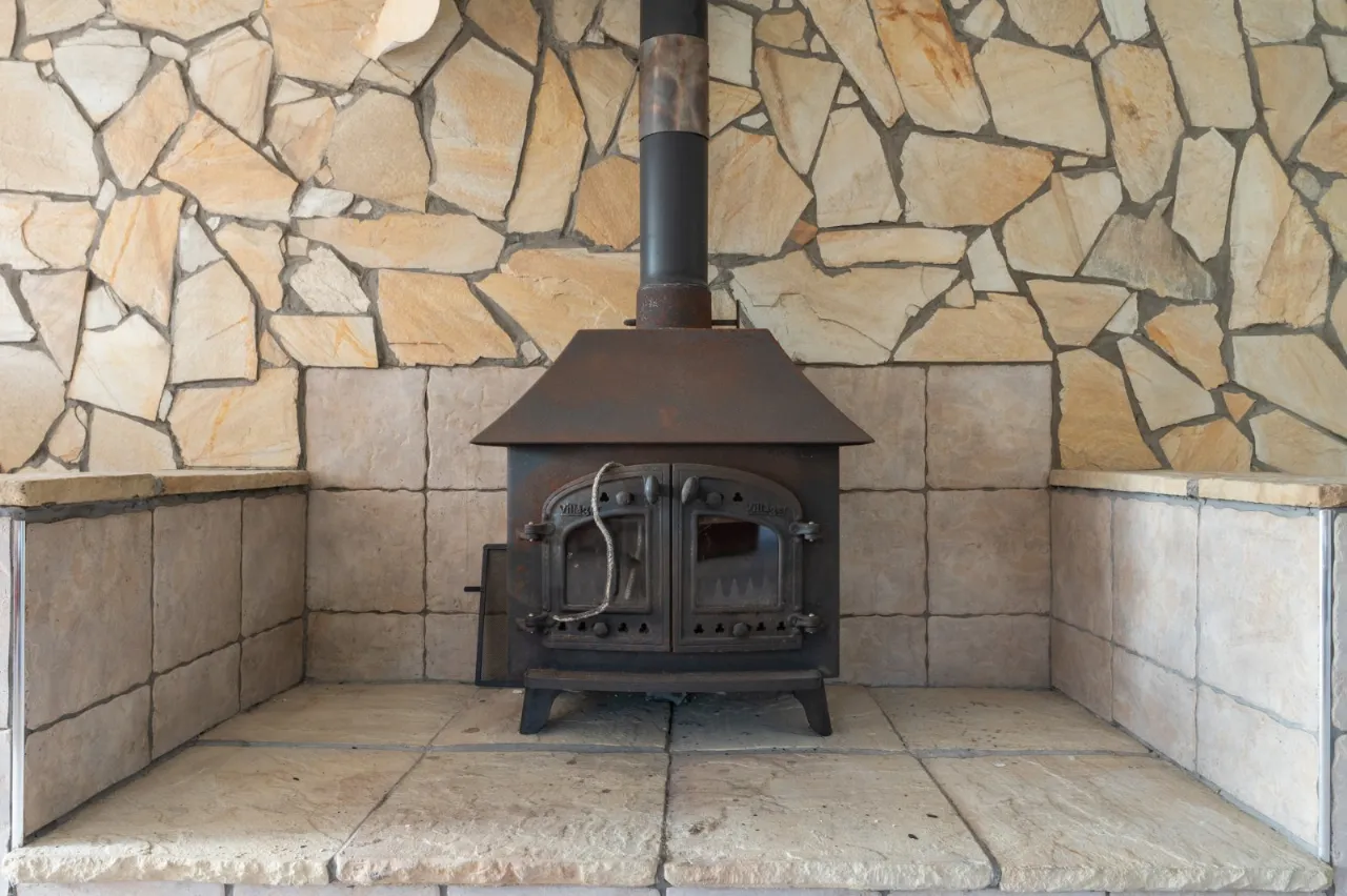 Outlook over front garden, stone fireplace with free standing cast iron stove, double doors to terrace area.
