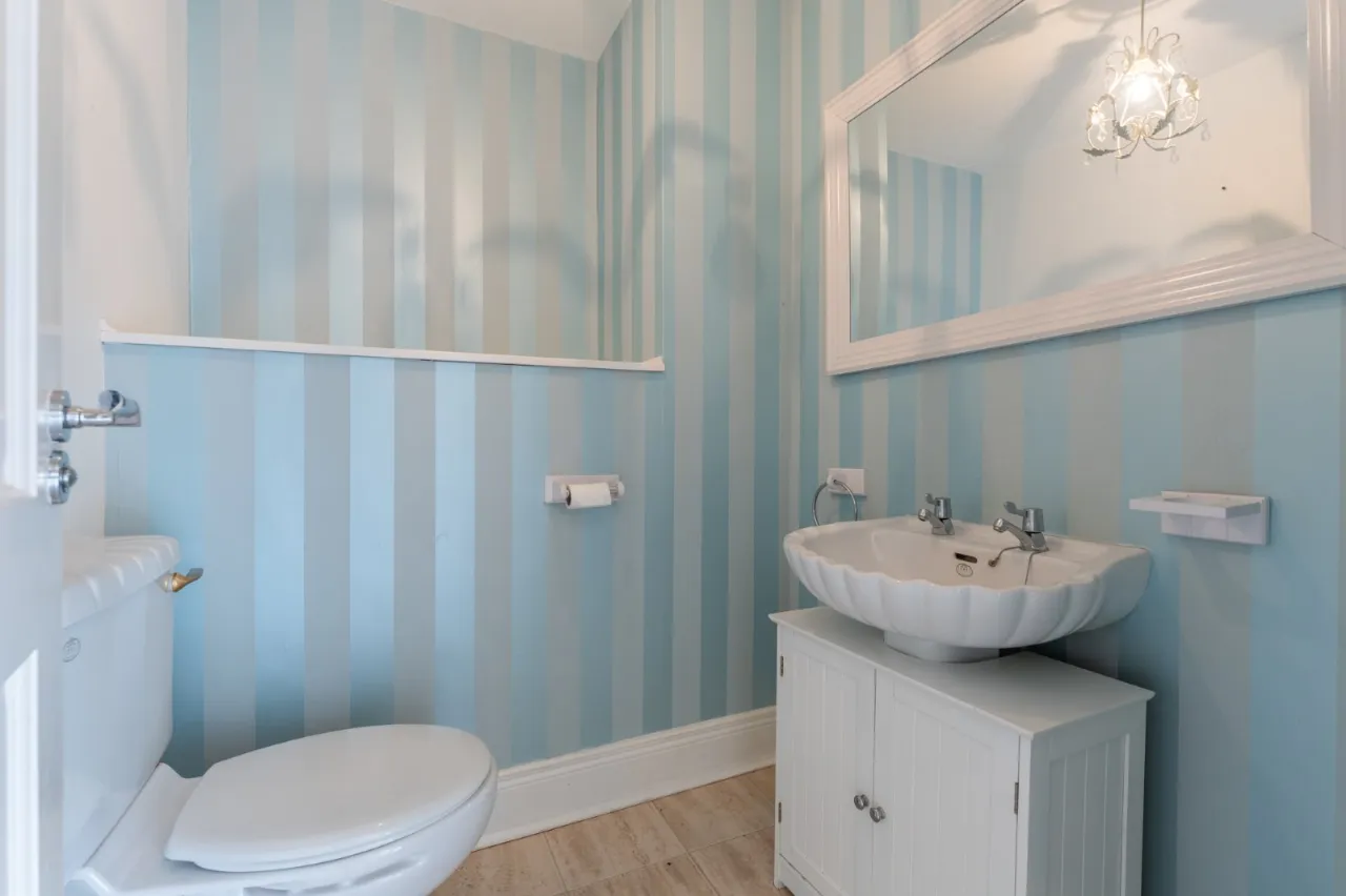 Panelled bath, low flush WC, pedestal wash hand basin.