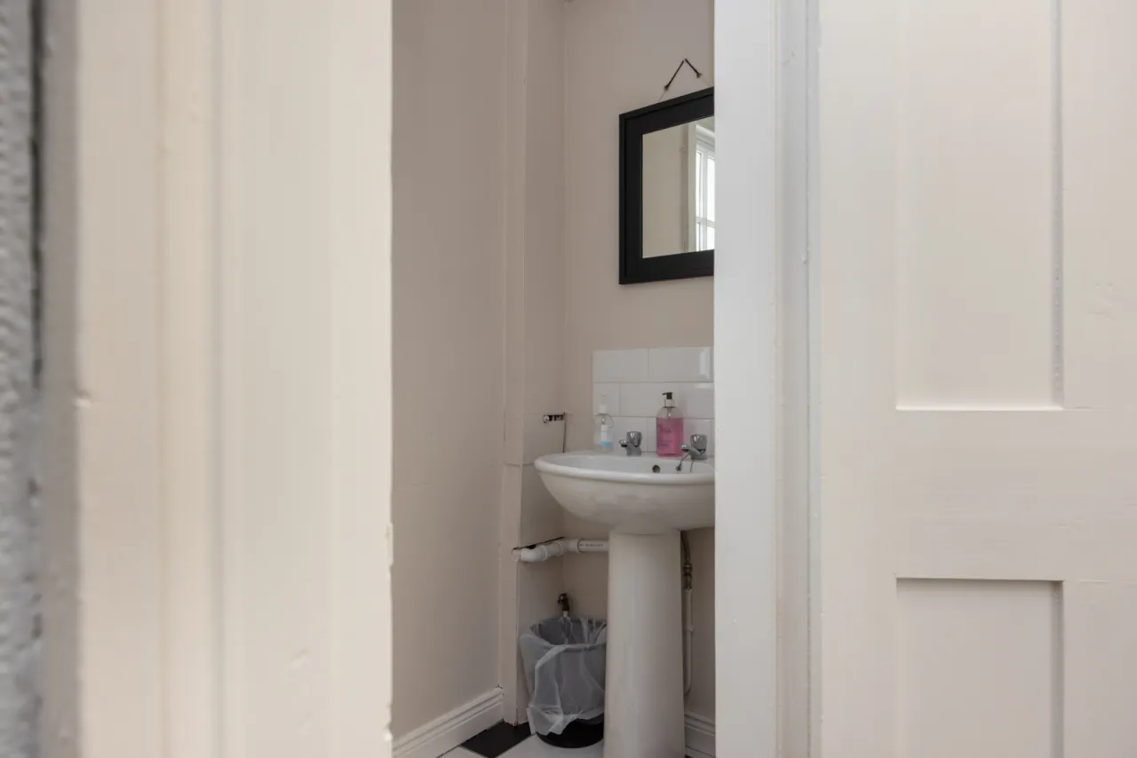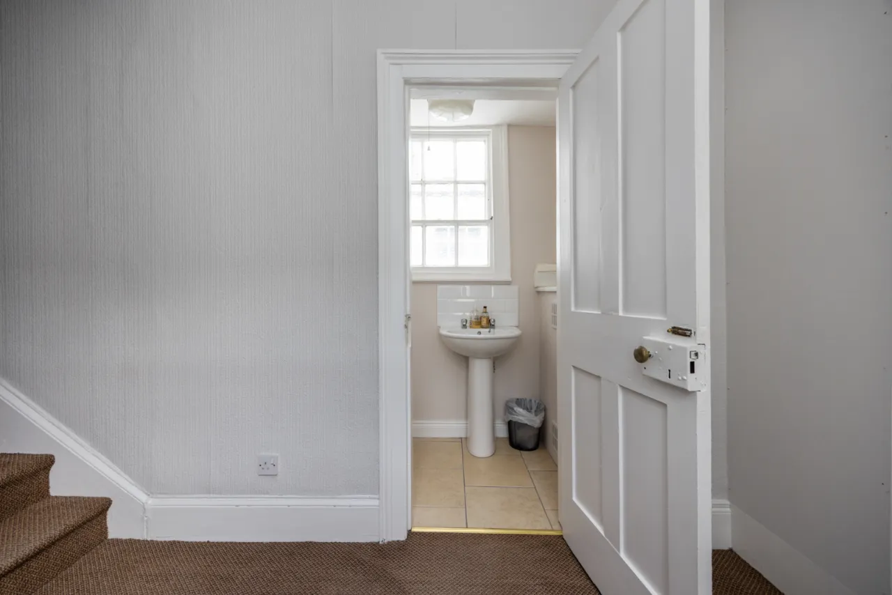 Low flush WC, pedestal wash hand basin, ceramic tiled floor.