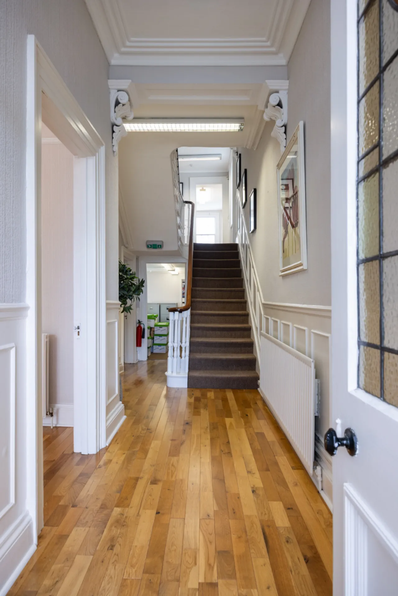 Solid wood flooring, corniced ceiling, ceiling rose, corbels, part wall panelling.