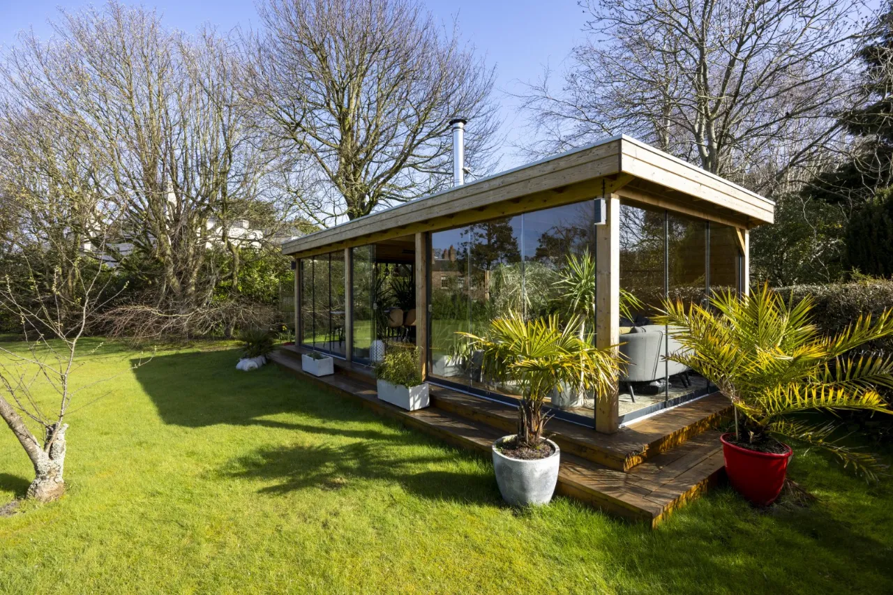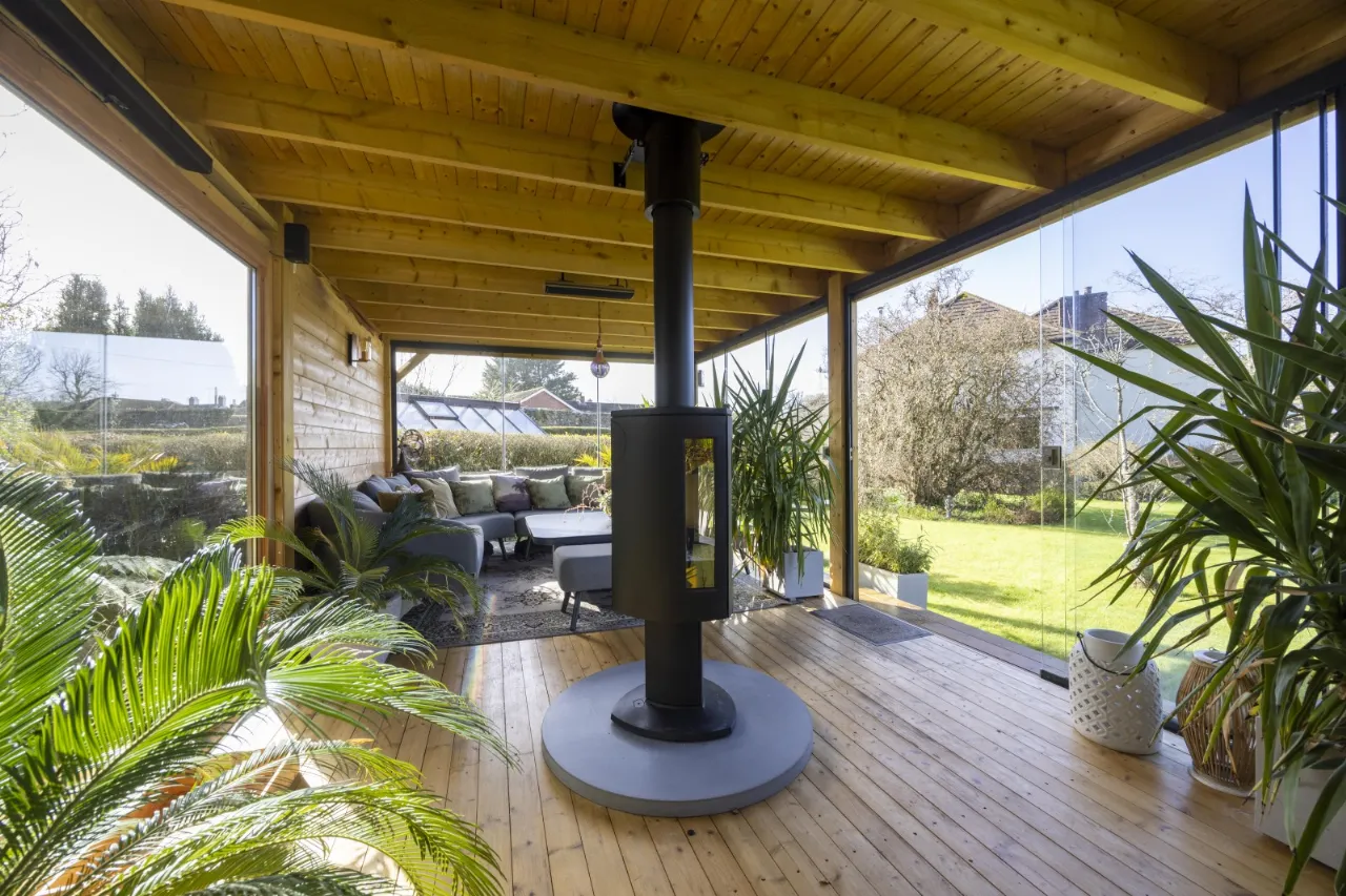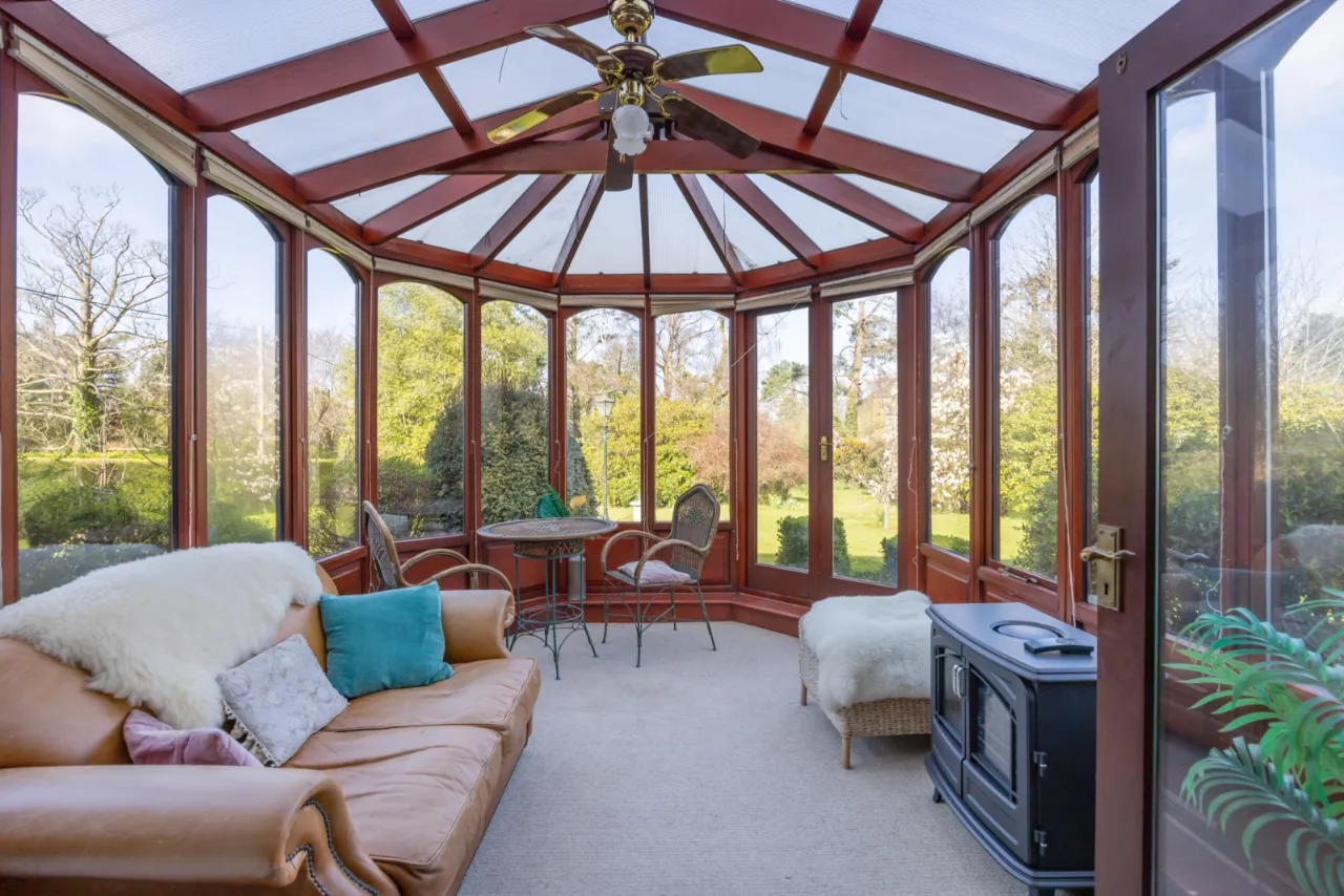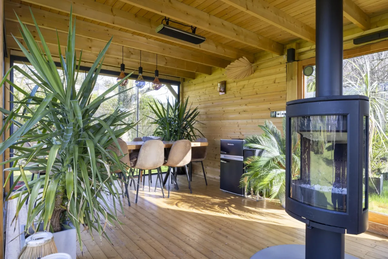 Featuring dining and seating areas, sliding glass doors to front and sides, double glazed panel to rear, Infrared thermostatically controlled heating, cast iron wood burning stove with concrete hearth, light and power including external floodlighting.