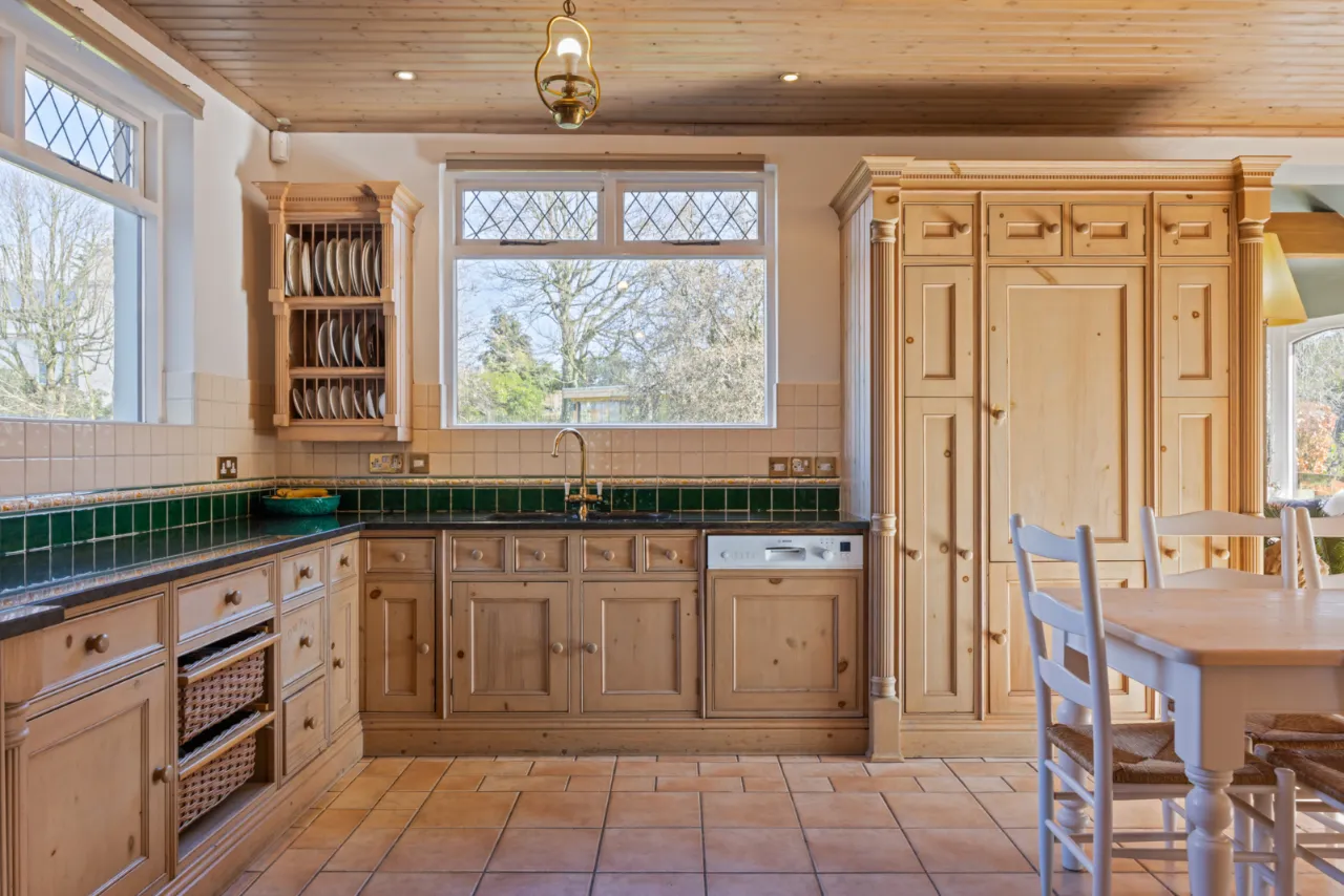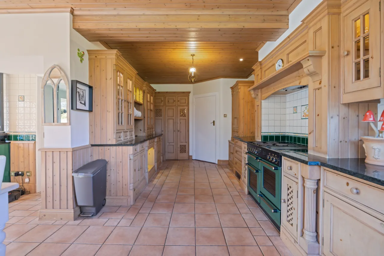 Bespoke fitted pine kitchen with range of high and low level units, granite work surfaces, inset twin sink unit and chrome mixer taps, built in pantry, built in shelving and plate racks, Rayburn stove, ceramic tiled floor, space for range cooker, integrated fridge and freezer, integrated dishwasher, mahogany double glazed sliding doors to patio and garden.