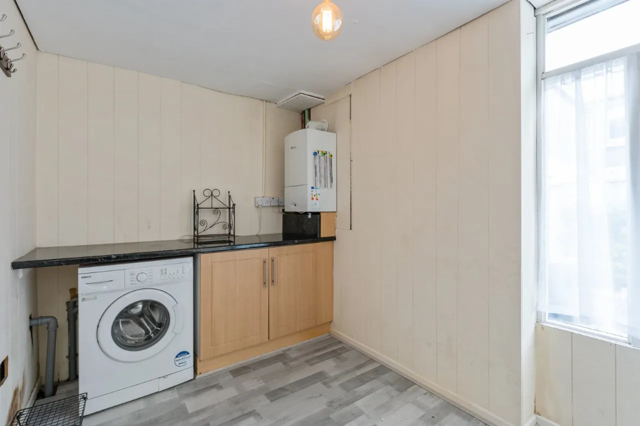 Cast iron fireplace with tiled inset. Range of high and low level units, uPVC double glazed door to:
