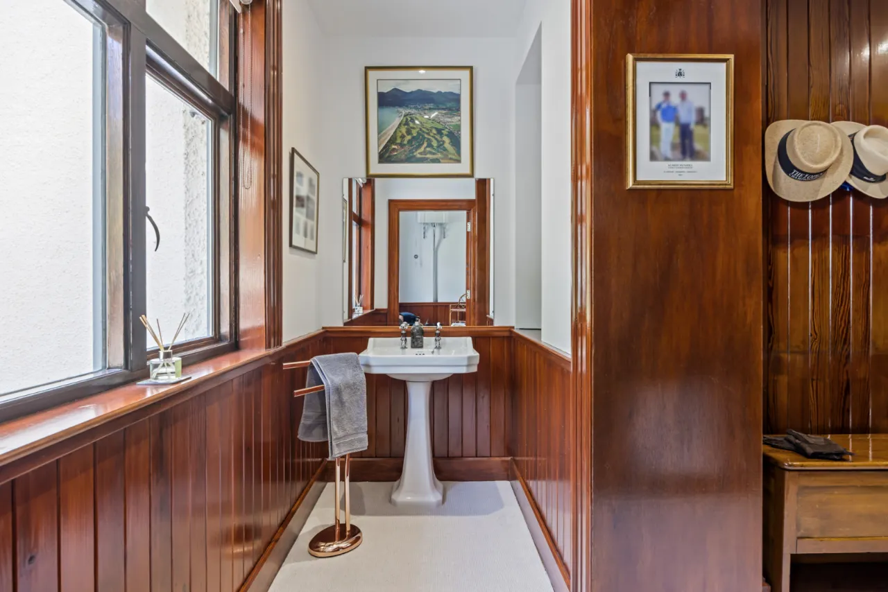 Original Pitch Pine tongue and groove panelled walls. Wash hand basin. Partly tiled walls.