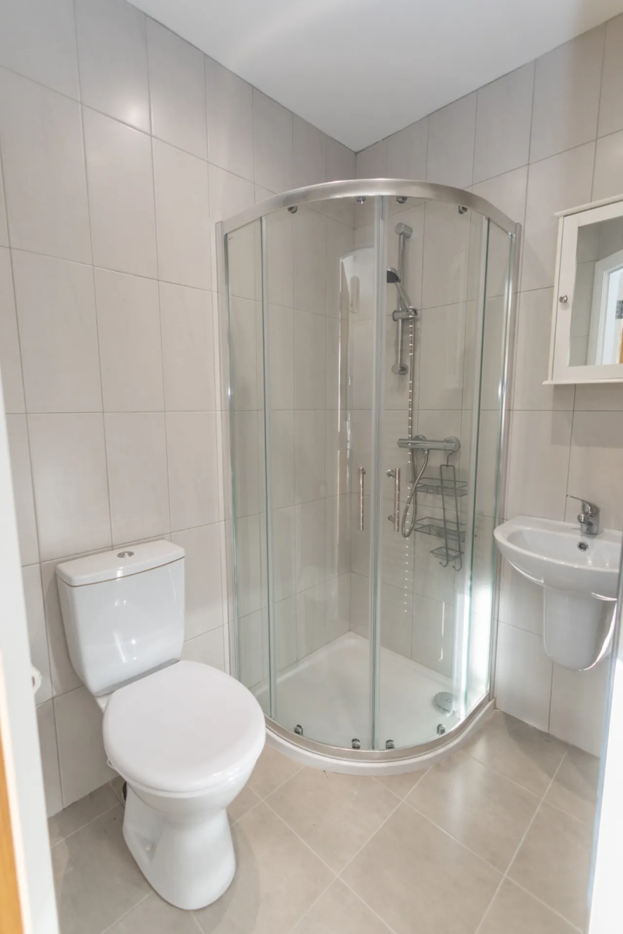 Tiled flooring and fully tiled walls; mains-powered corner shower; white suite with WC and wash hand basin; wall-mounted vanity unit above; heated towel rail.