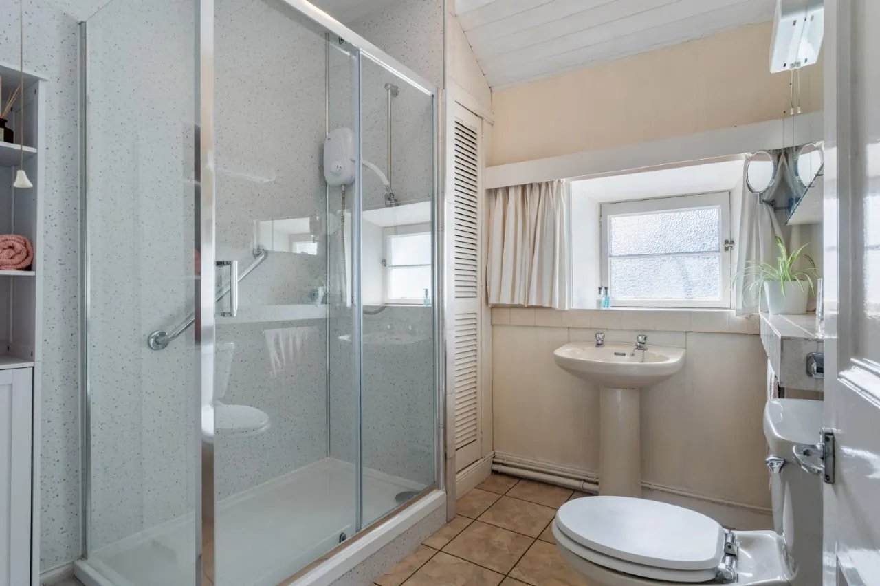 Coloured suite comprising pedestal wash hand basin, low flush WC and power shower