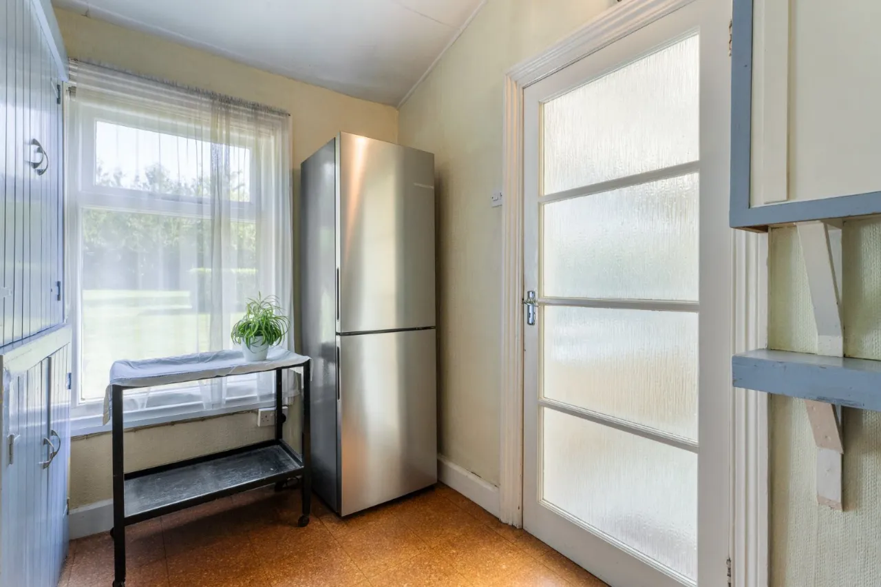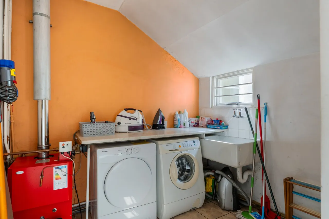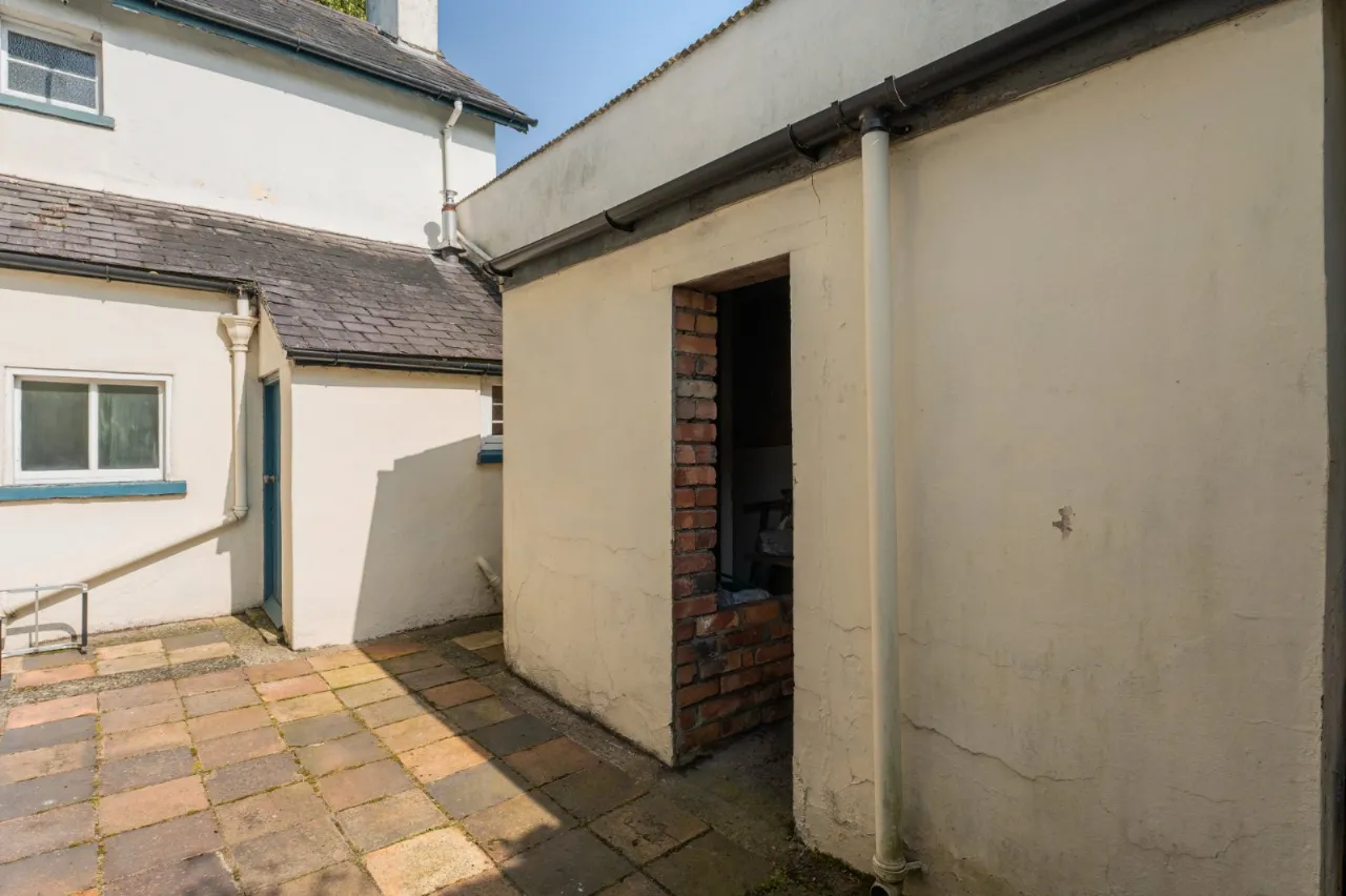 Belfast sink, plumbed for washing machine, leading to enclosed yard with outhouse