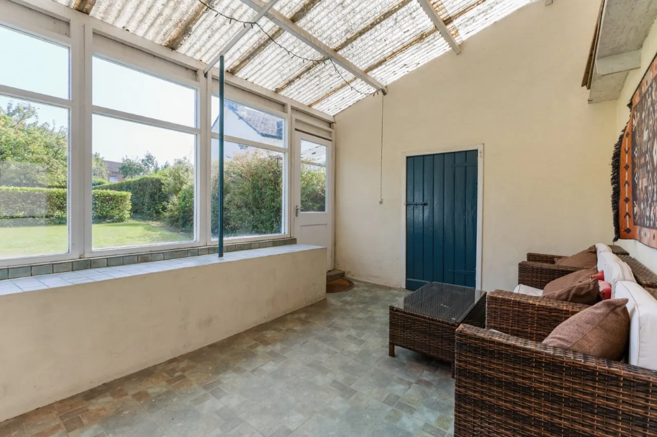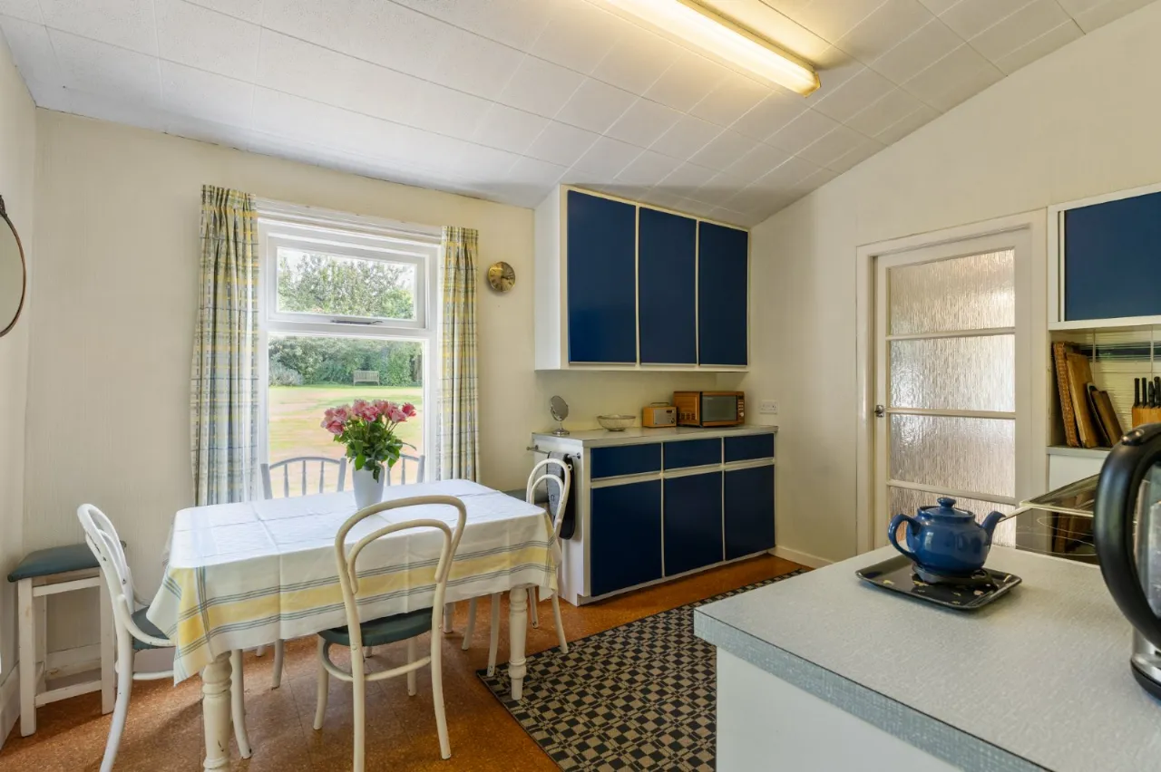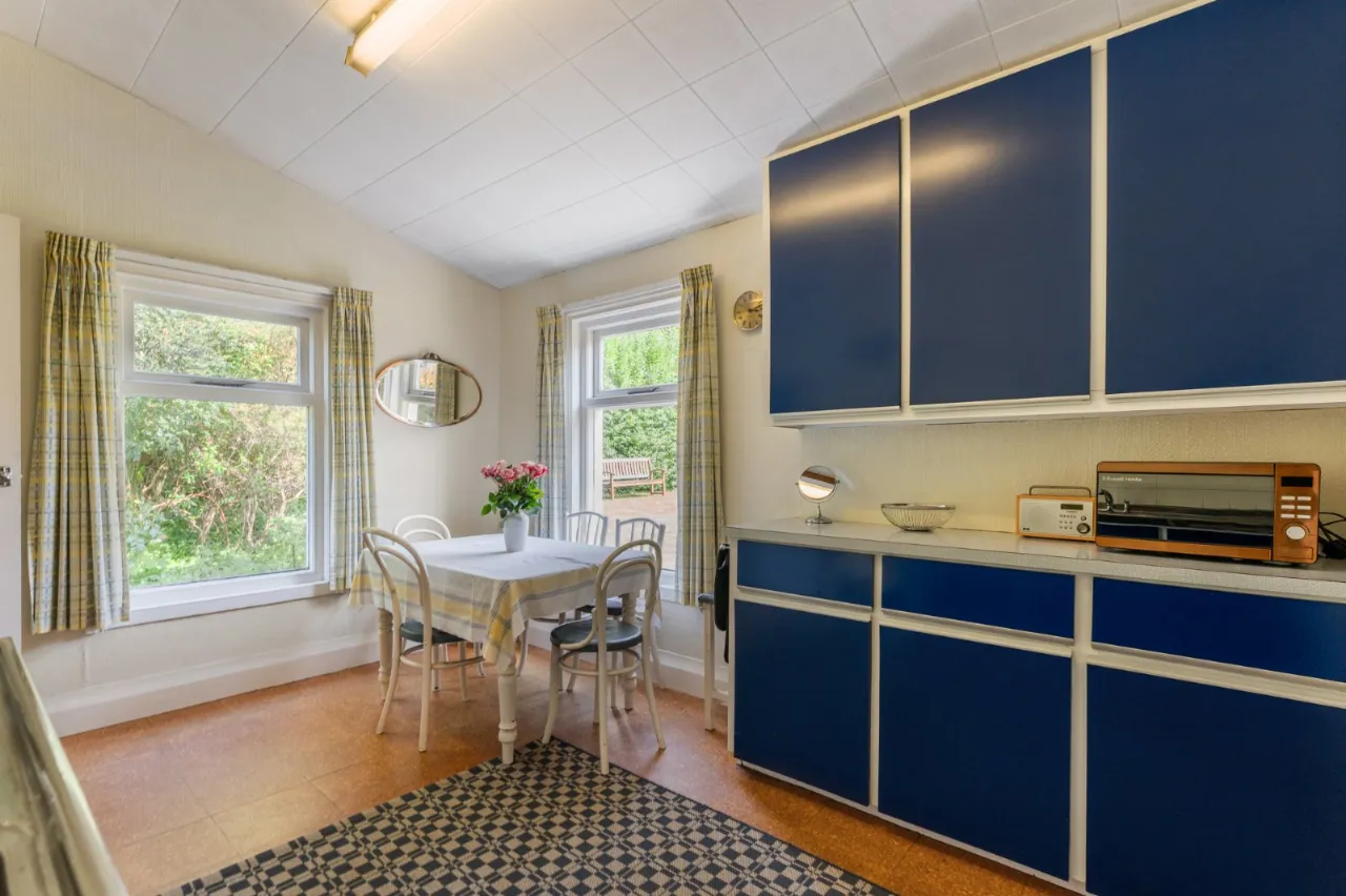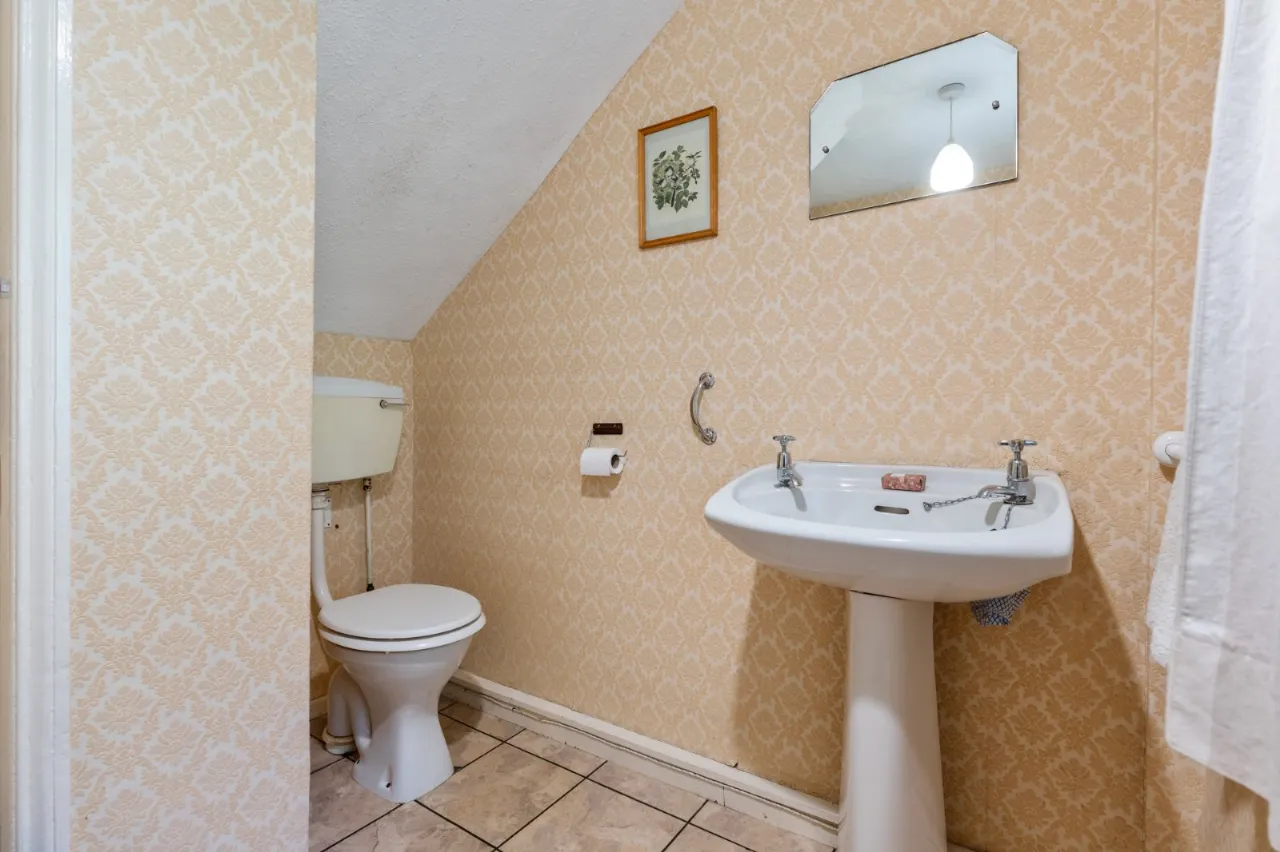 Belfast sink, plumbed for washing machine, leading to enclosed yard with outhouse