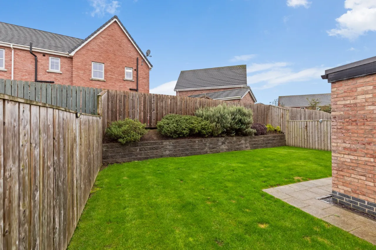 Neat front garden in lawn. Tarmac driveway. Spacious enclosed rear garden in lawn with raised beds planted with shrubs. Two large paved patio areas. Outside light ,tap and power.