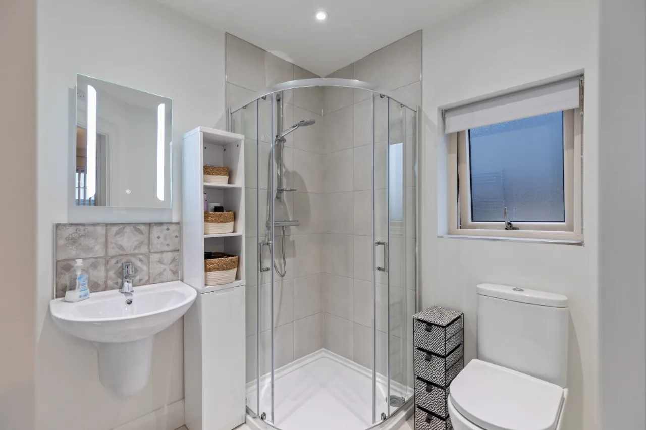 White suite. Corner shower cubicle with thermostatically controlled shower. Wash hand basin. Low flush WC. Tiled floor. Recessed lights. Extractor fan. Illuminated mirror. Heated chrome towel rail.
