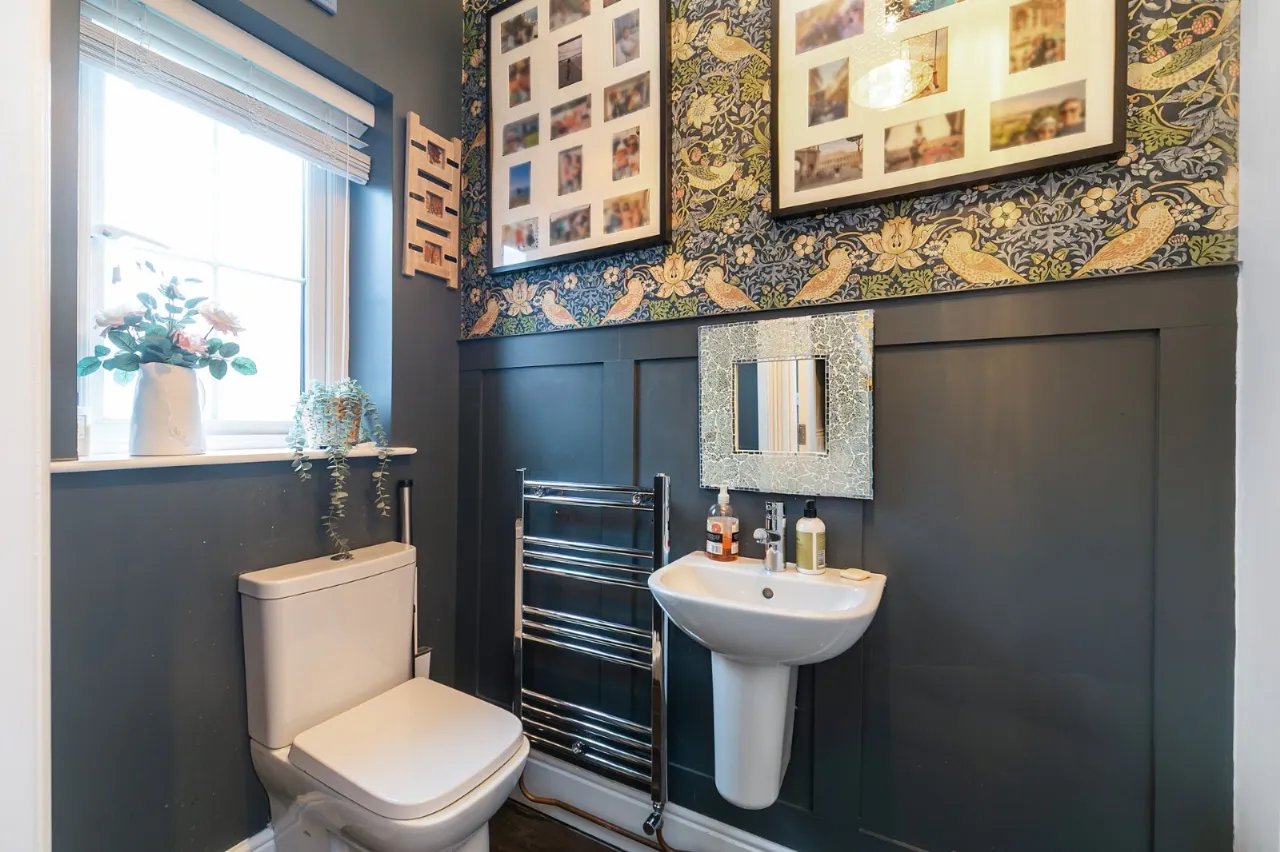 Low flush WC, pedestal wash hand basin, chrome heated towel rail