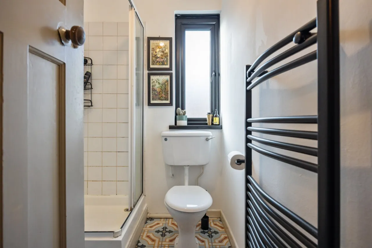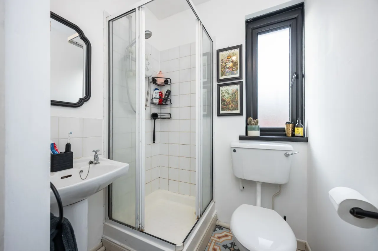 Tiled floor, low flush WC, pedestal wash hand basin, fully tiled shower cubicle with Mira electric shower, hotpress