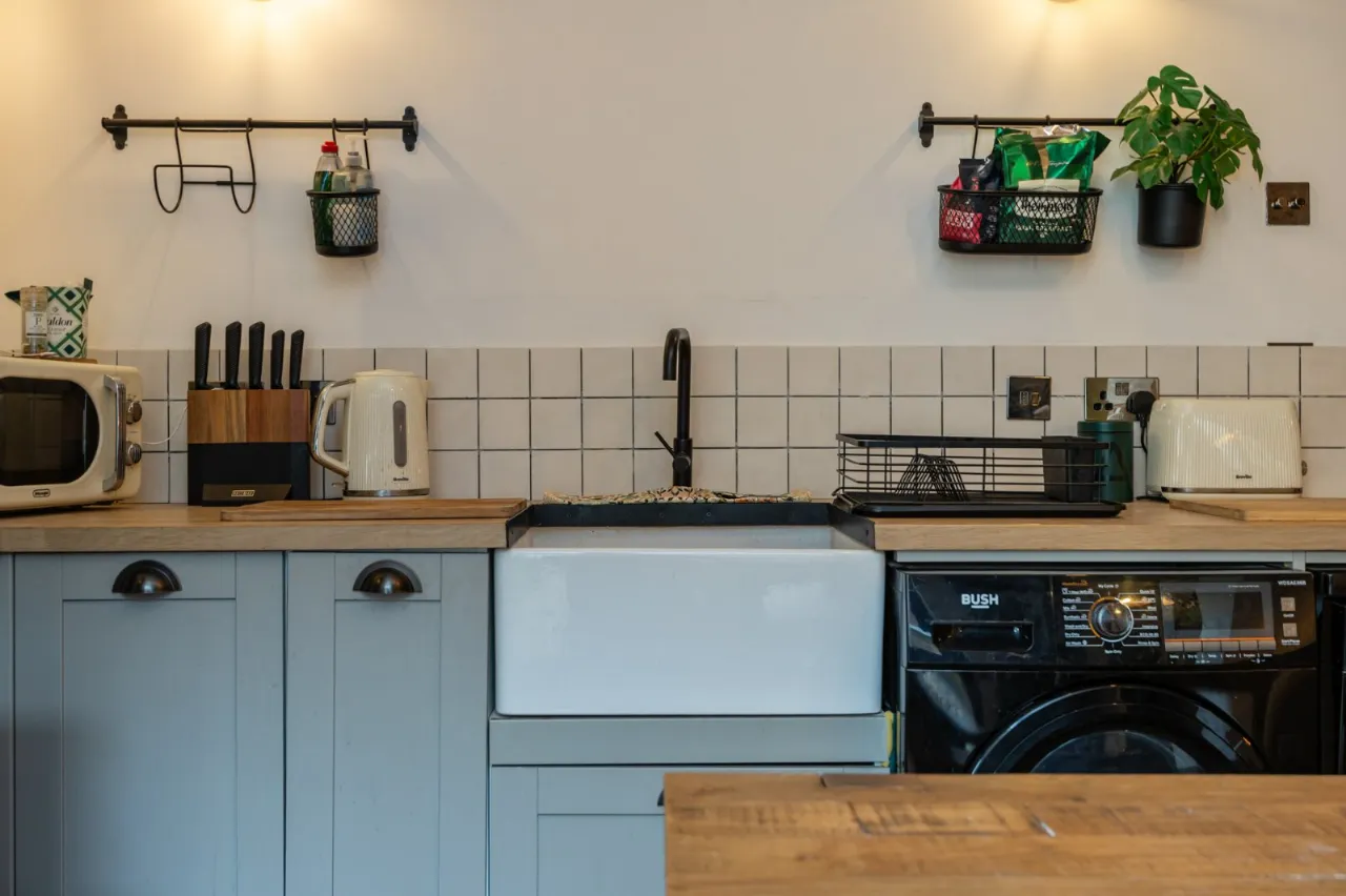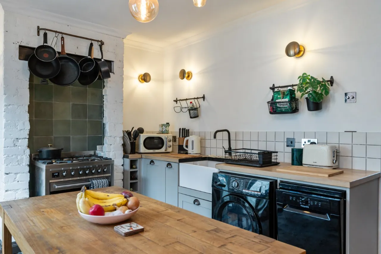 Solid wood floor, range of high and low level units, solid wood worktops, old Belfast sink, plumbed for washing machine, pluumbed for dishwasher, wine rack, SMEG oven and 5 ring gas hob, part tiled walls, double uPVC doors to outside
