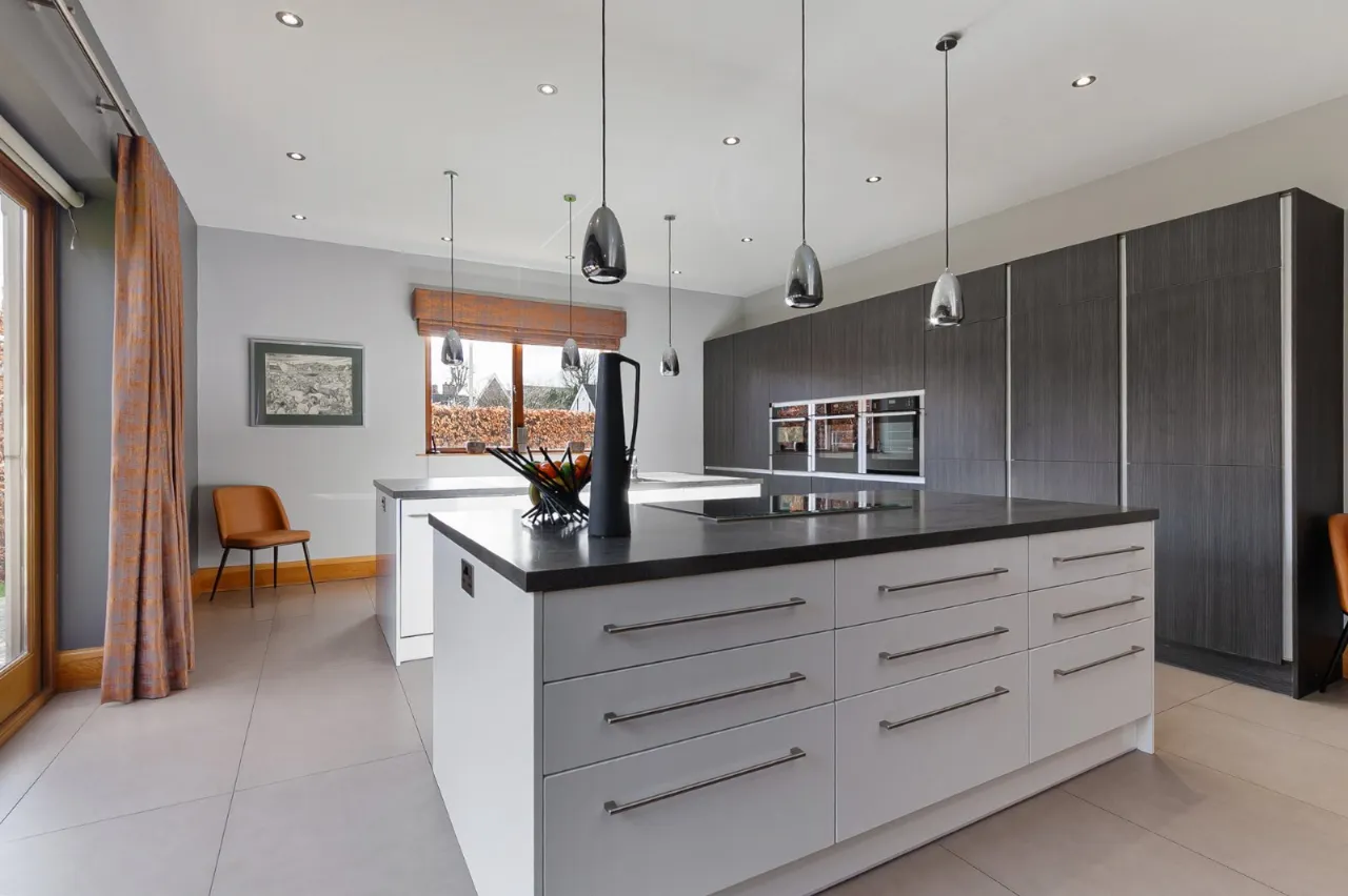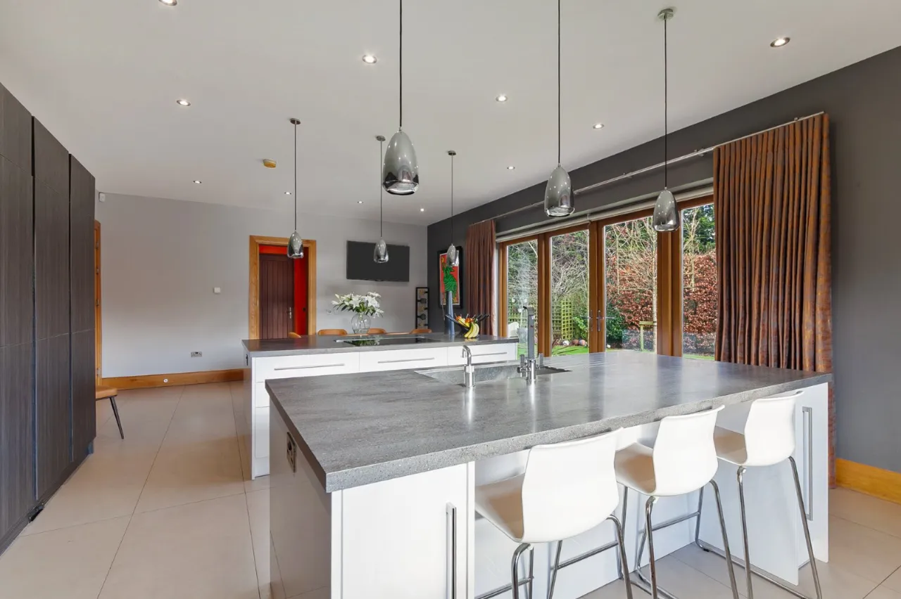 Luxury kitchen with full range of high and low level units, two central island, inset sink, quooker tap, integrated fridge freezer, double oven, microwave, two dishwashers, double doors to rear garden