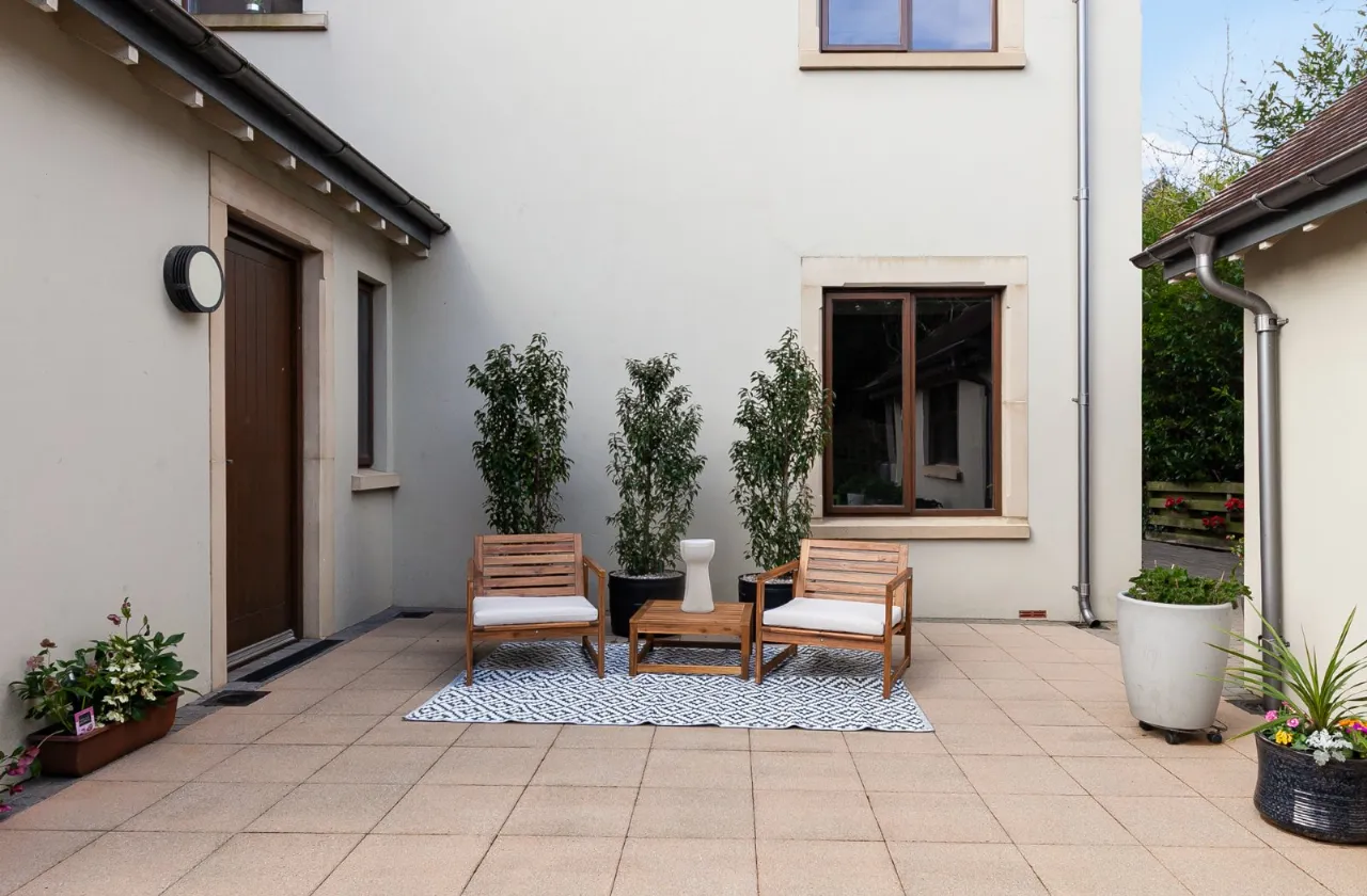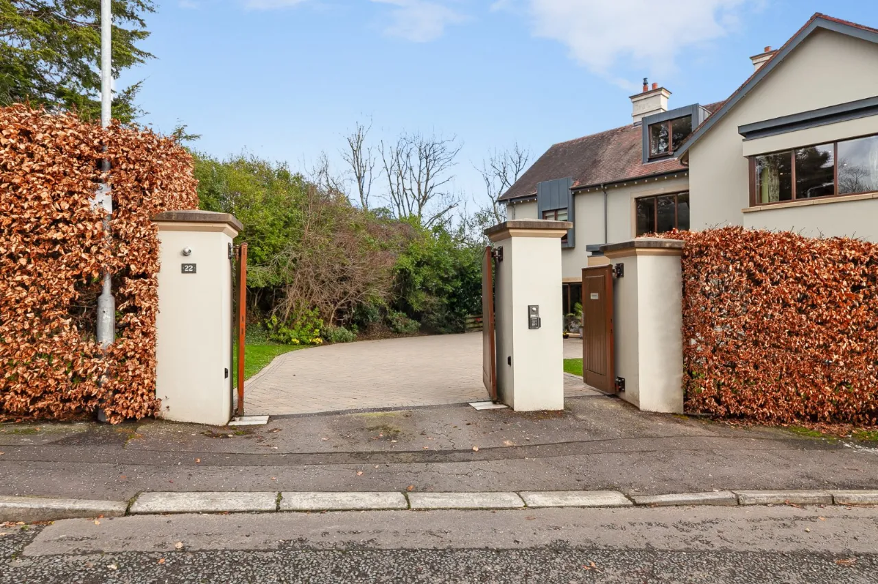 Electric gates leading to generous driveway parking, gardens front and rear lawns and patio, outside light and tap