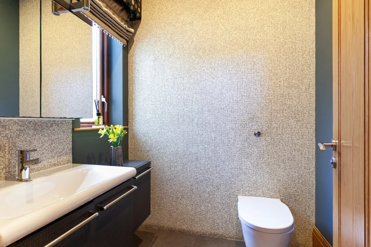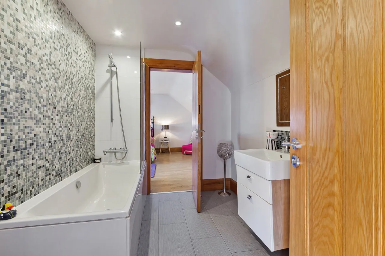 White suite, panelled bath, mixer taps, telephone hand shower, WC and wash hand basin