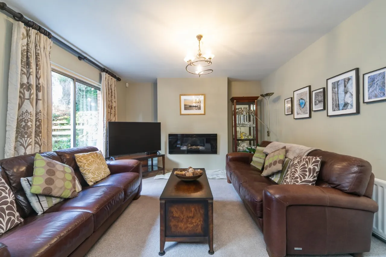 Wall mounted gas fireplace, sliding aluminium doors to paved patio