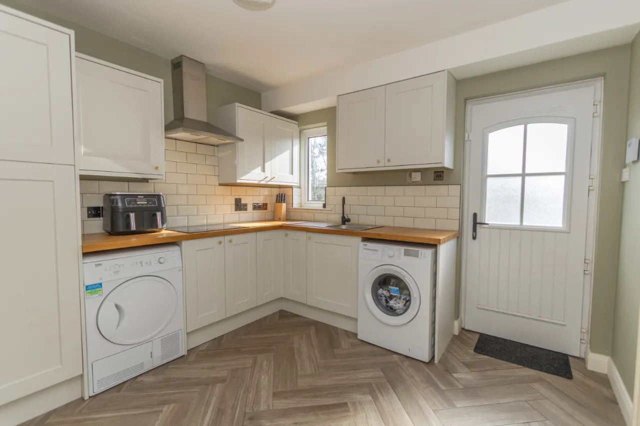 Accessible via Kitchen. Subway tiles, herringbone wood effect tile floor, black nickel sockets, induction hob, stainless steel sink, washer, dryer.