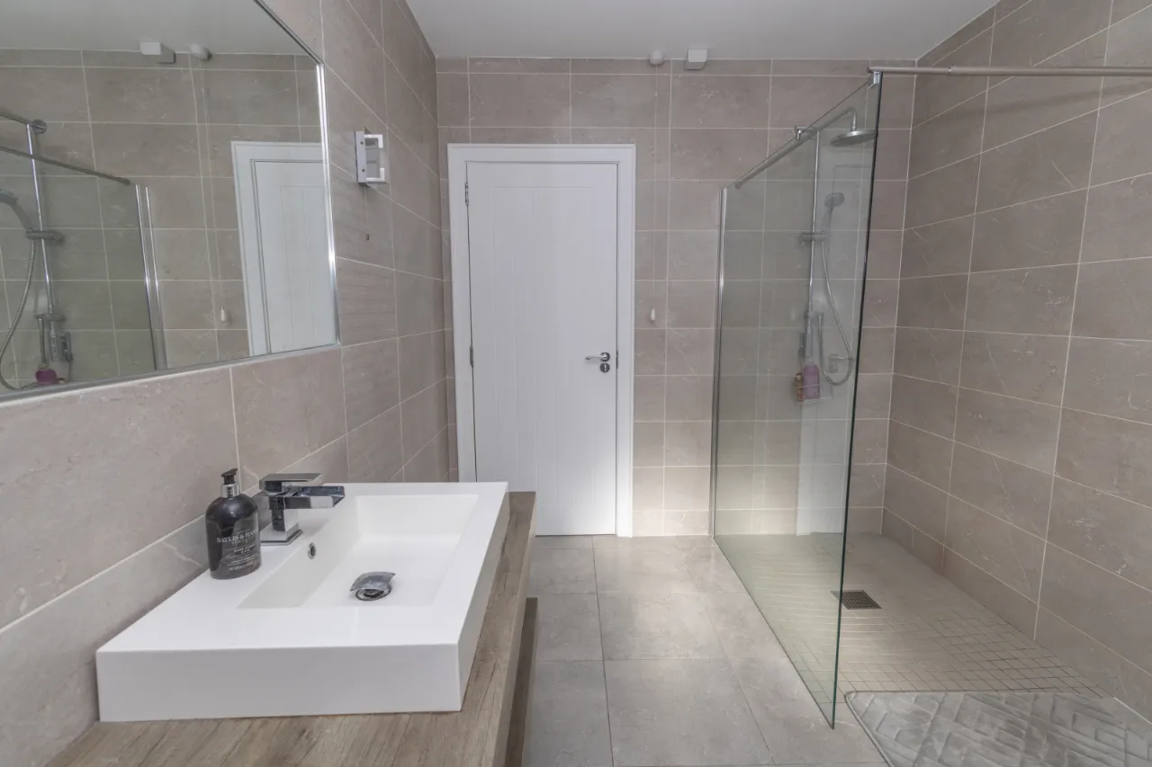Towel radiator, walk-in shower, floating sink, high/low level flush toilet.