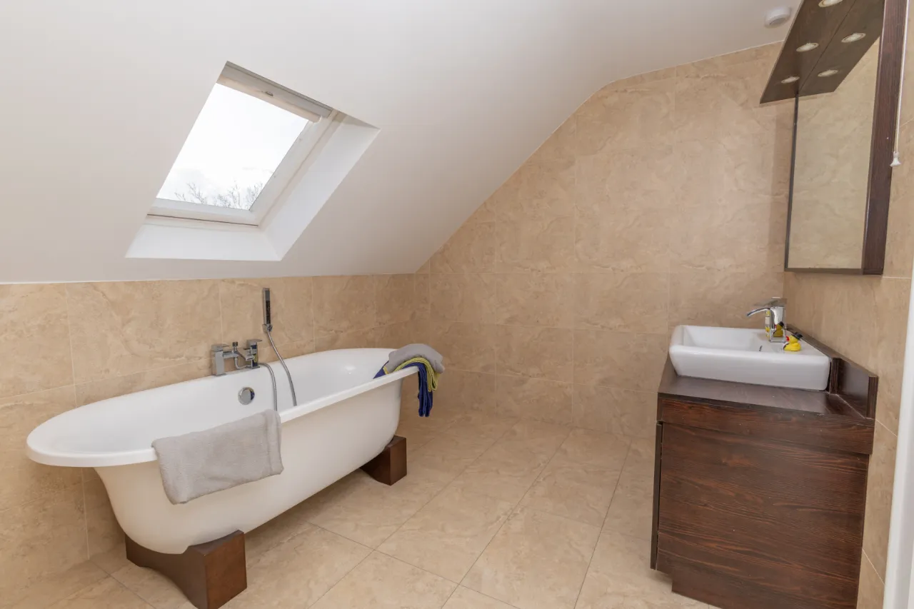 Tiled flooring, bath with mixer tap and hose, vanity unit with wood effect finish, LED mirror, motion sensor light.