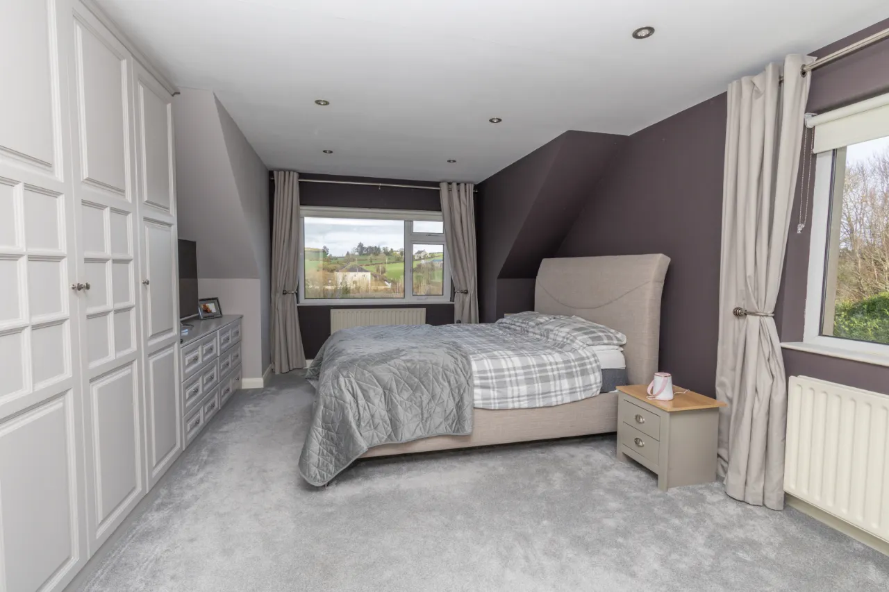 Oak laminate flooring, built-in wardrobes.