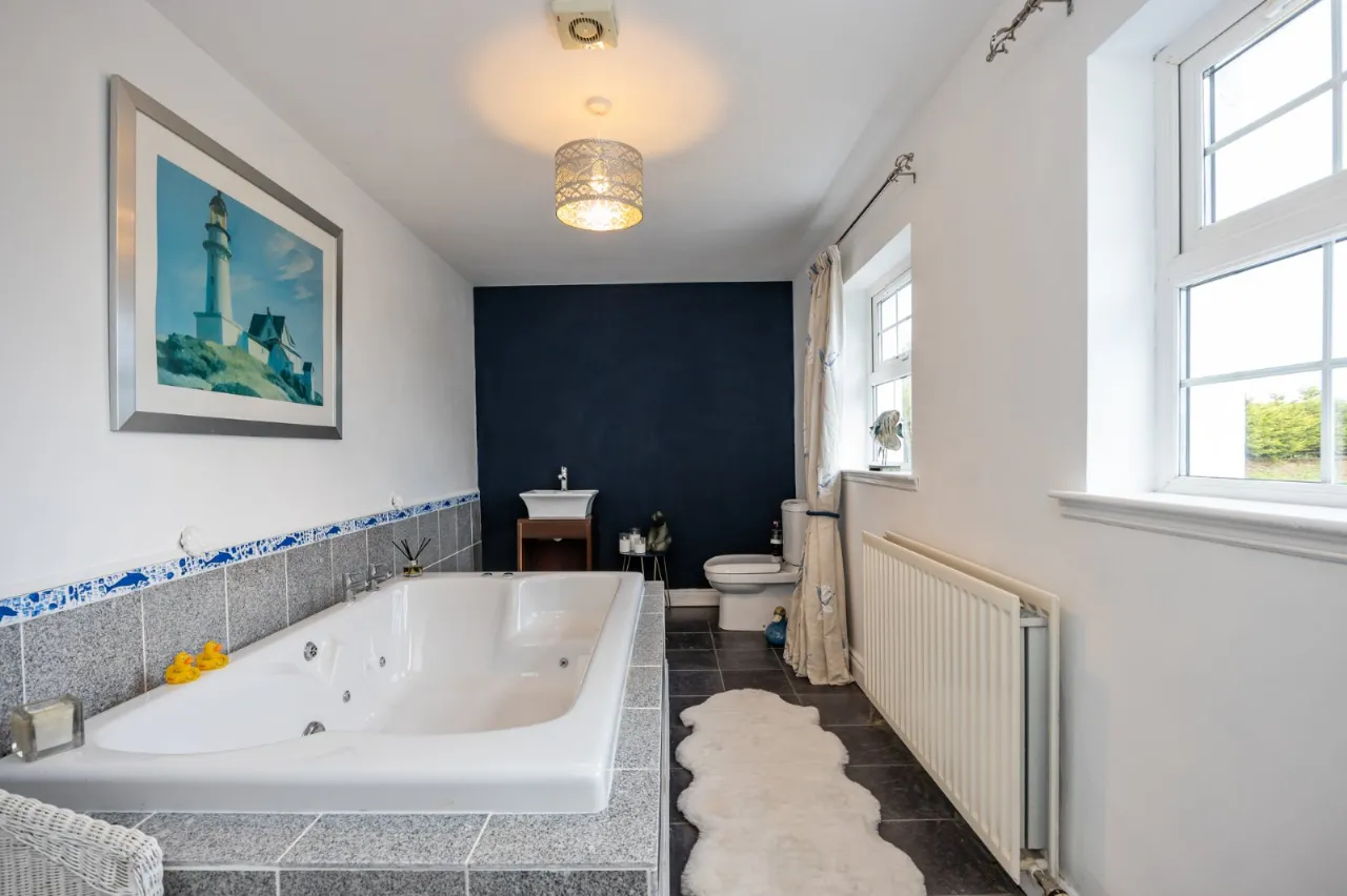 Modern white suite comprising: Large panelled multi jet bath, vanity floor stand with wash hand basin with mixer taps, push button WC, wall tiling, ceramic tiled floor, extractor fan, concealed hotpress, Megaflo high efficiency tank.