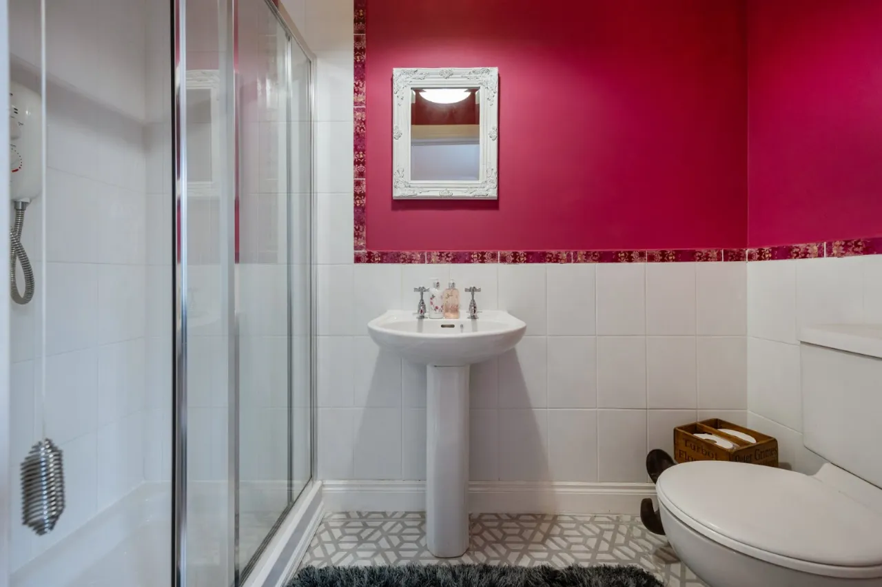 White suite comprising: Separate fully tiled shower cubicle with Mira thermostatically controlled shower unit, pedestal wash hand basin, low flush WC, wall tiling, ceramic tiled floor, extractor fan, towel radiator.