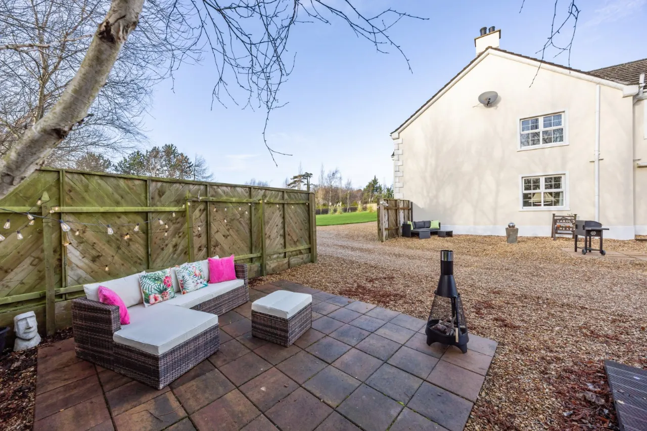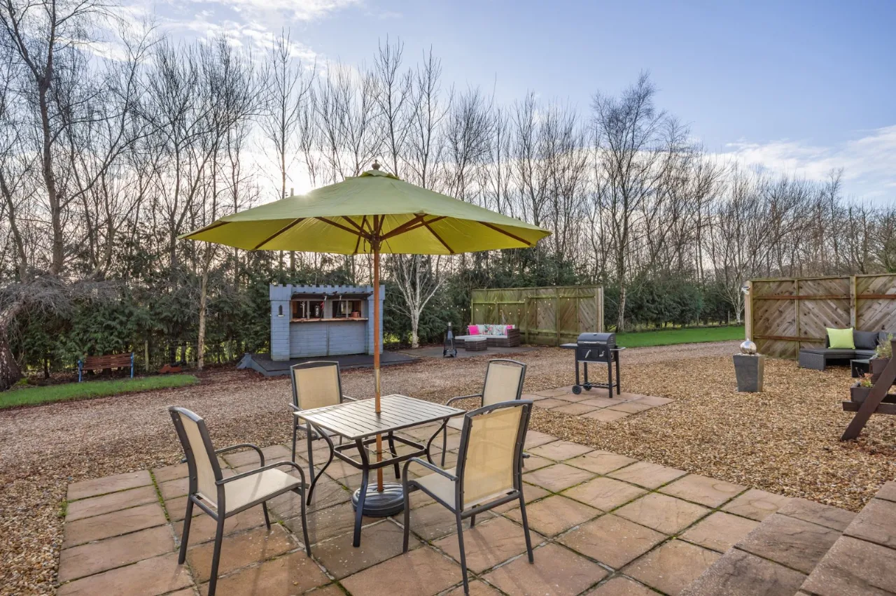 To front, side and rear in landscaped gardens, manicured lawns, paved patios, large gravel patio, themed garden bar with timber deck, selection of mature trees, hedging, fenced storage area.