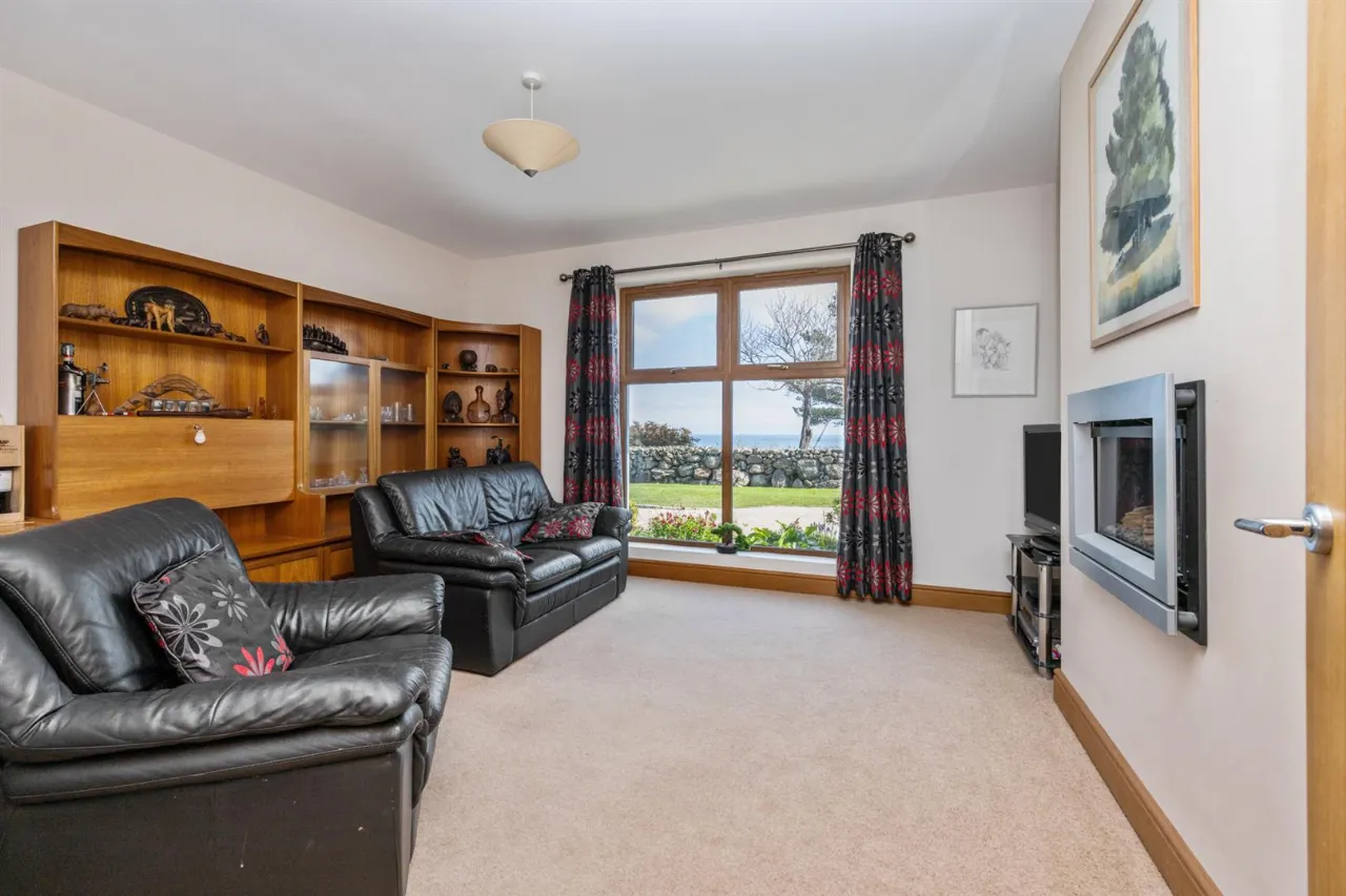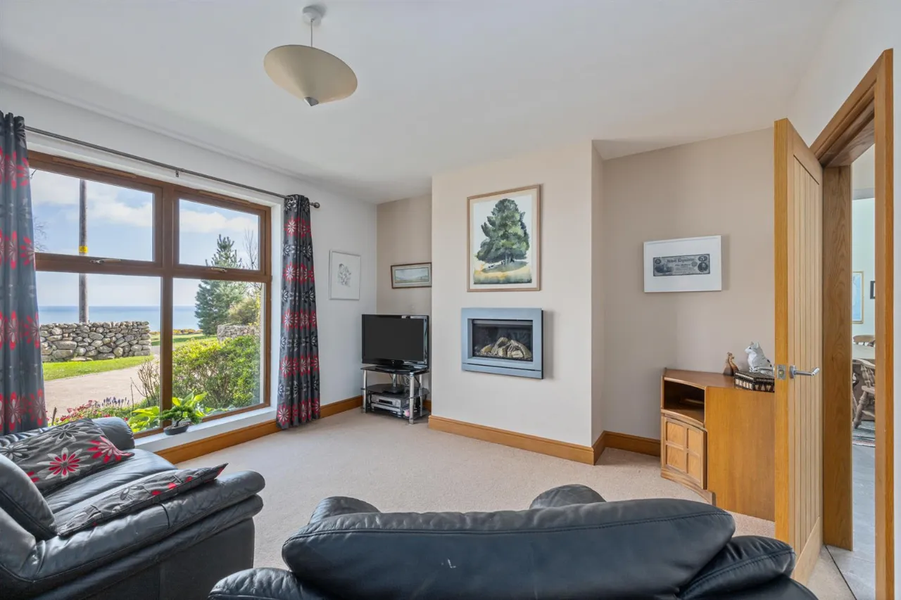 Family room featuring a gas fire, carpeted flooring, sea views, and a front-facing aspect.