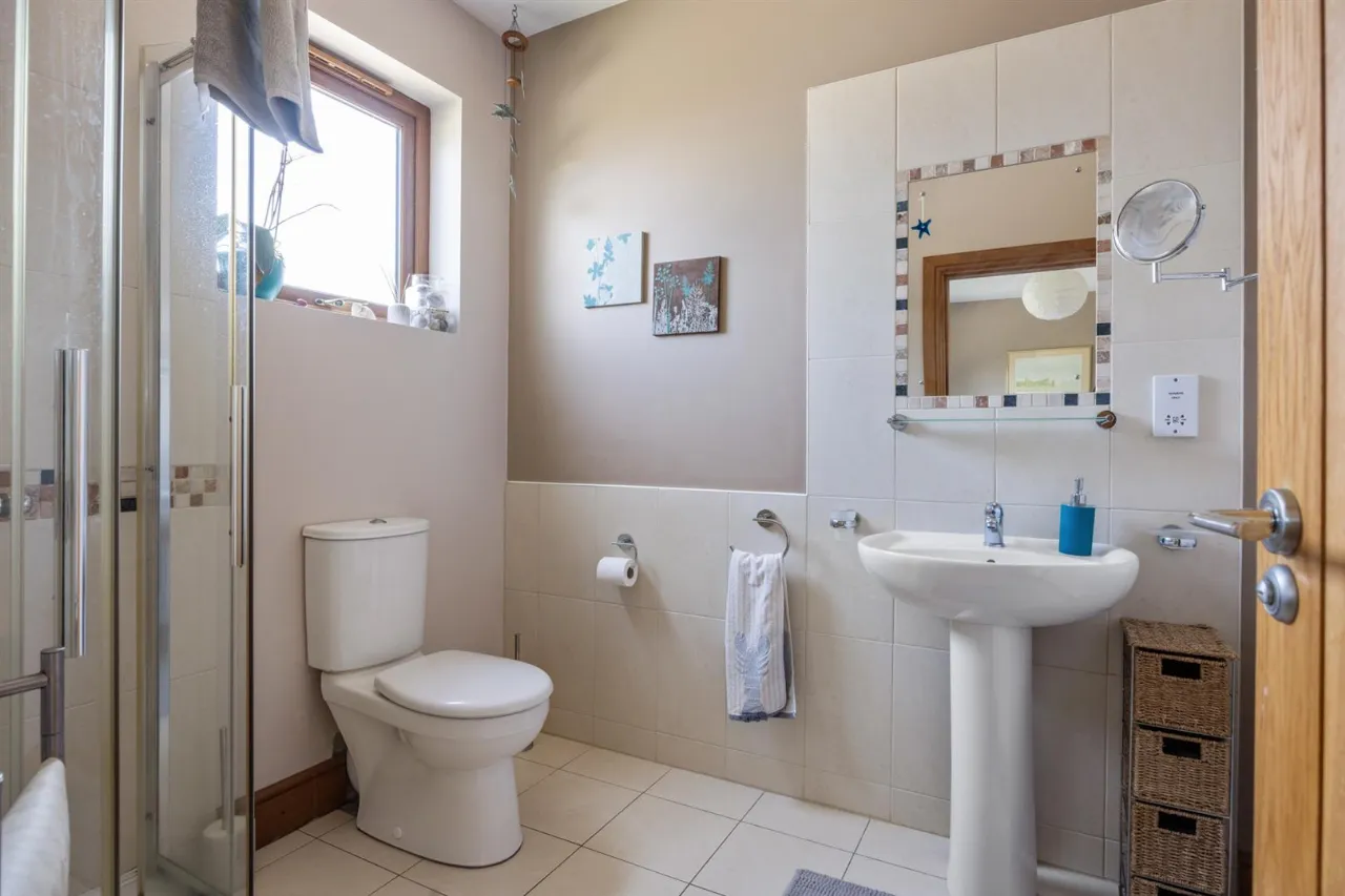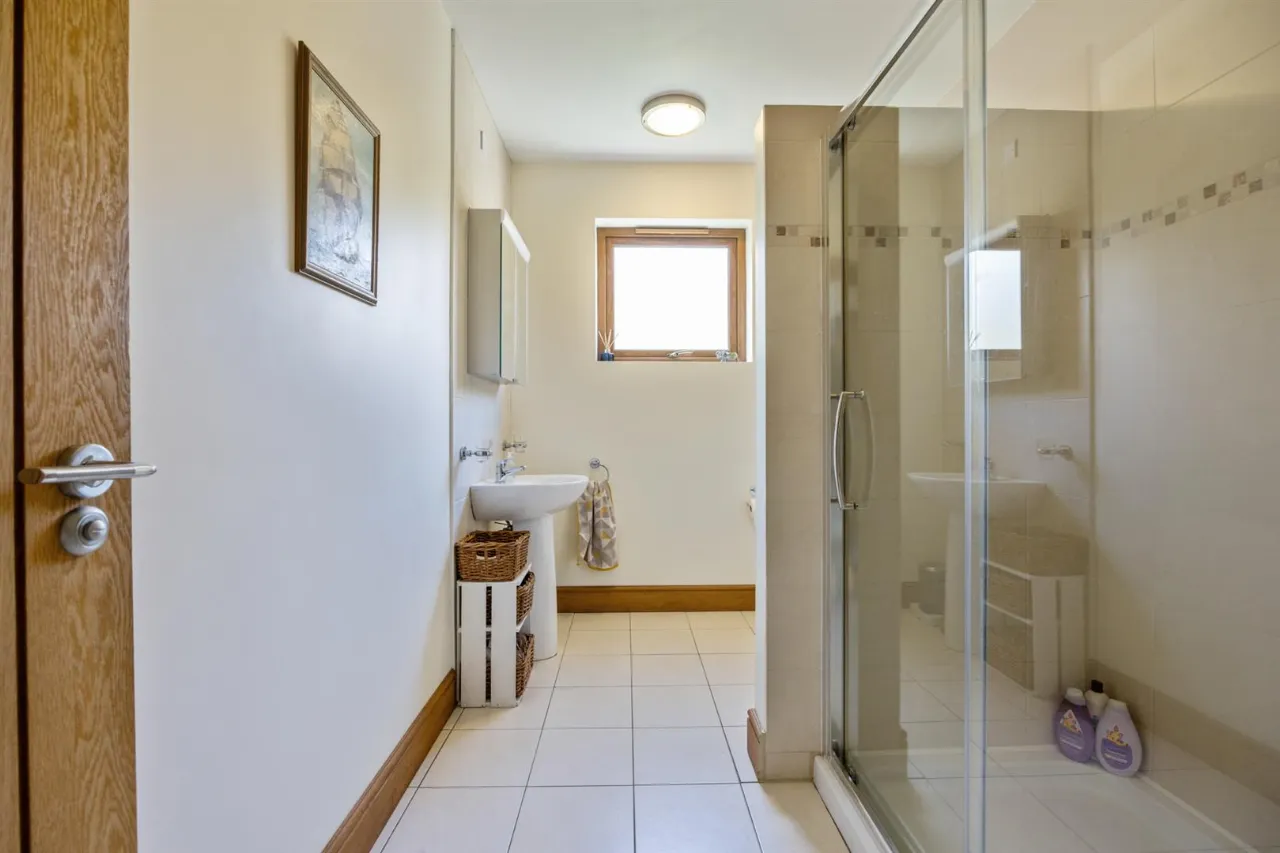 Bathroom fitted with a white suite comprising a low flush WC, and wash hand basin, with a walk in shower enclosure.