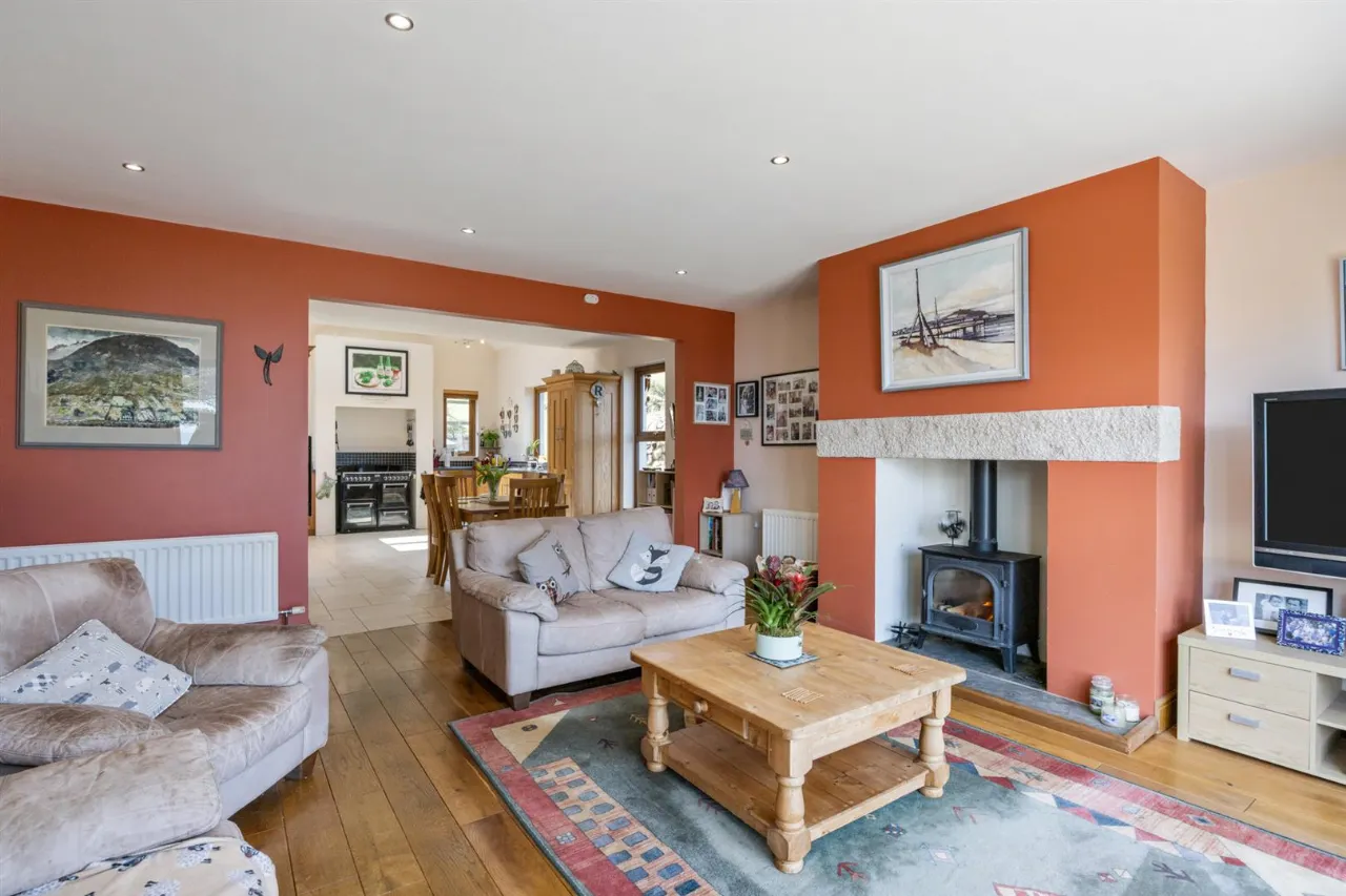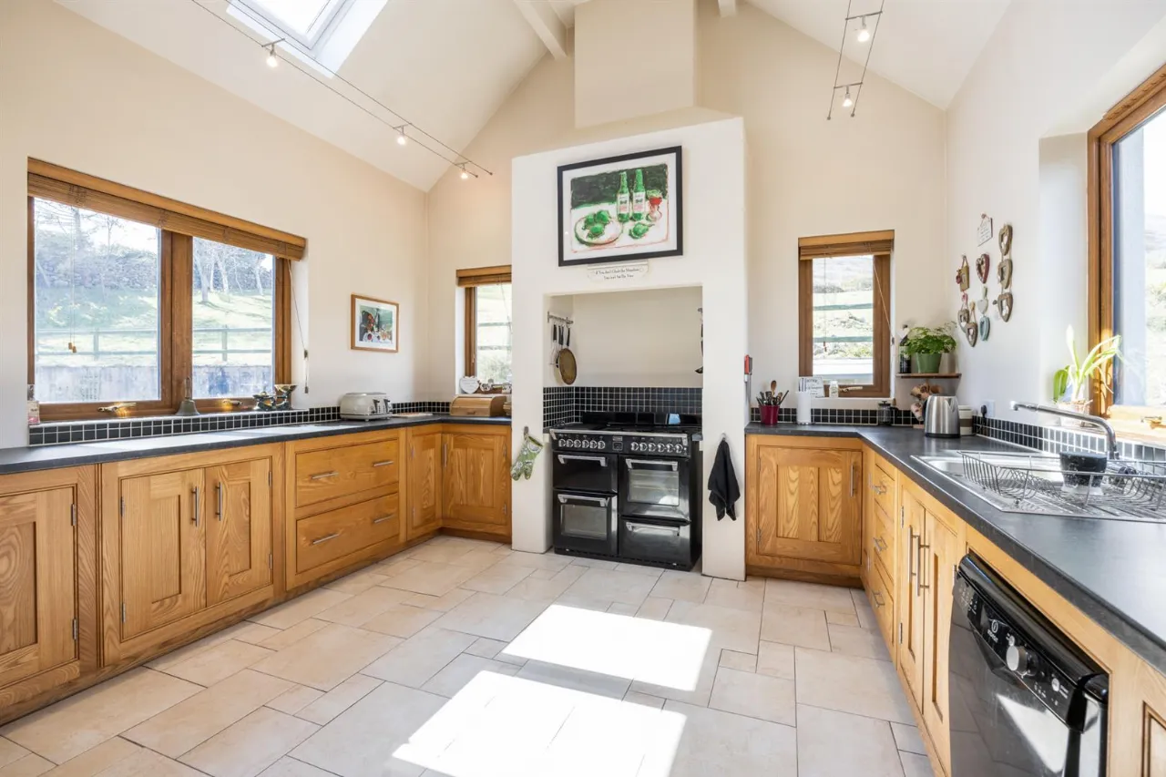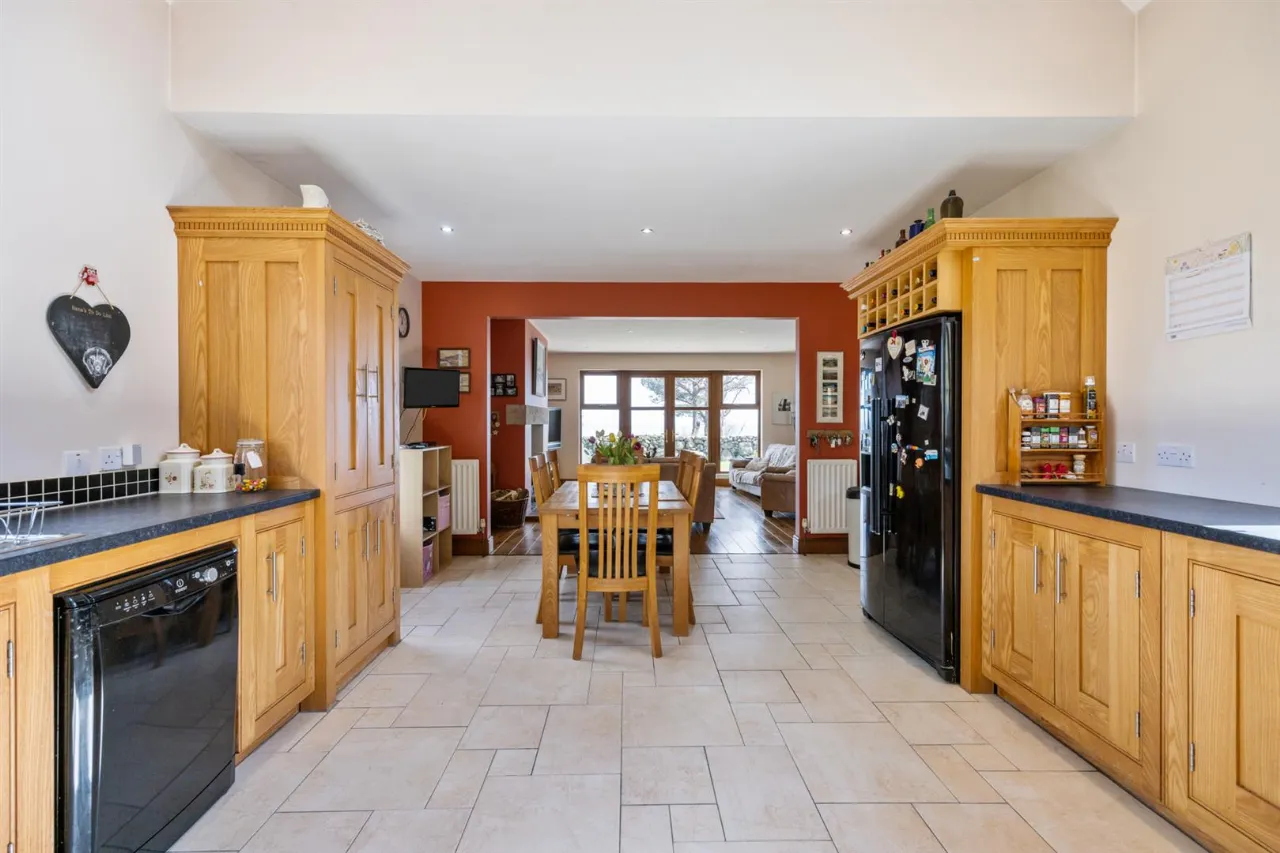Open-plan kitchen, dining, and living area featuring a solid wood kitchen with granite work surfaces, range-style cooker, and space for a fridge freezer and dishwasher. The kitchen has a rear aspect, with tiled flooring, while the living area benefits from hardwood flooring, and expansive glass doors leading to the front aspect of the property.
