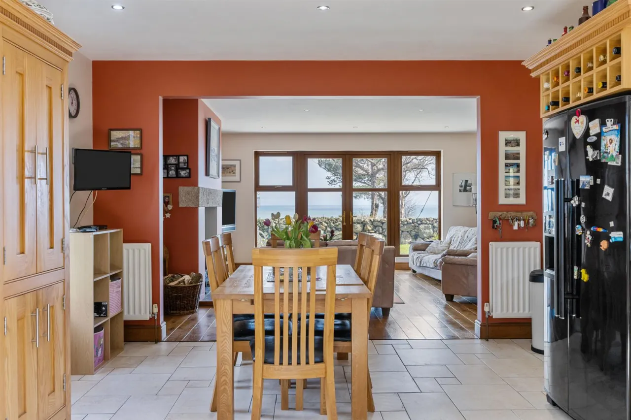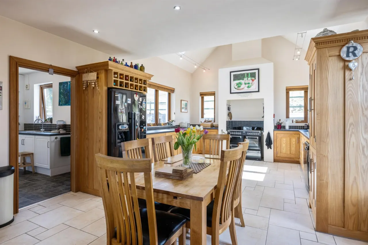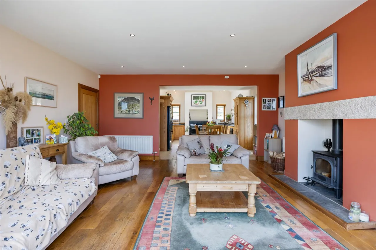 Open-plan kitchen, dining, and living area featuring a solid wood kitchen with granite work surfaces, range-style cooker, and space for a fridge freezer and dishwasher. The kitchen has a rear aspect, with tiled flooring, while the living area benefits from hardwood flooring, and expansive glass doors leading to the front aspect of the property.